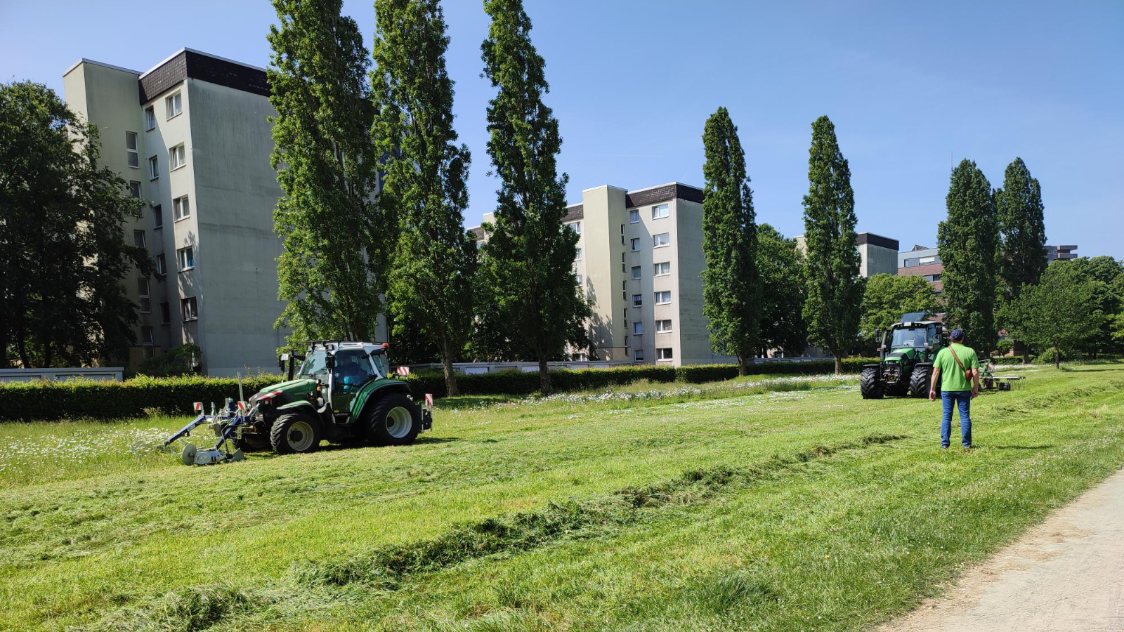 Unsere Aufgabe ist es, dazu beizutragen, dass die Bürger*innen weiterhin gerne beim Lernen im Volksgarten sitzen, sich im Rheinpark sonnen oder durch den äußeren Grüngürtel joggen können. Ebenfalls betreuen und pflegen wir 55 Friedhöfe, 4.000 Hektar Wald und 81.000 Straßenbäume. Mittlerweile sind wir dabei auch für unser ökologisches Grünflächenmanagement ausgezeichnet worden, da uns Artenvielfalt und Naturschutz besonders am Herzen liegt.
