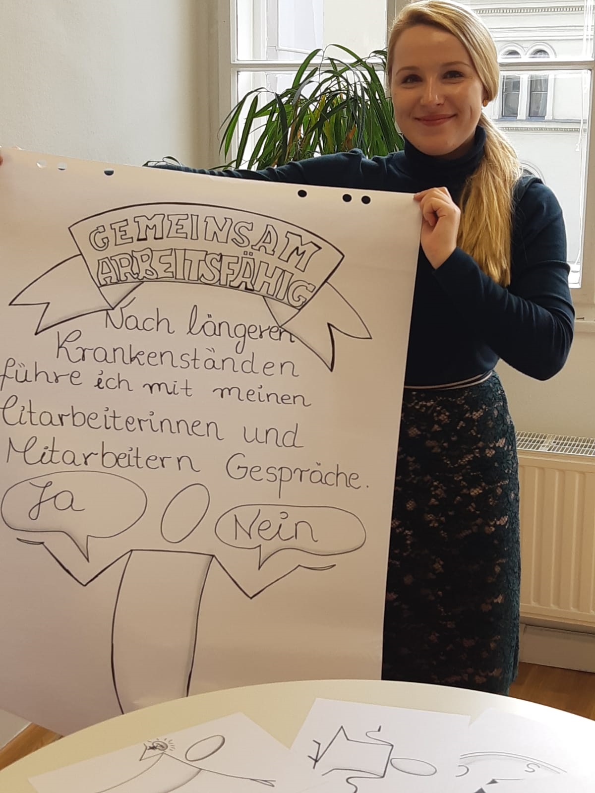 Was waren meine Aufgaben? Die waren ganz abwechslungsreich - vom Zeichnen, Schreiben eines Drehbuchs bis zur Bearbeitung der arbeitsmedizinischen und arbeitspsychologischen Stellungnahmen. Wie denn Zeichnen, würde man sicherlich gerne nachfragen? Tatsächlich konnte ich an den ersten zwei Tagen meines Praktikums mit meiner Mentorin ein "Gerüst" für ein Blockseminar ausarbeiten. Hierbei konnte ich mein, bei der Verwaltungsreform der Stadt Köln, erworbenes Wissen über die Visualisierung von Inhalten gut einsetzen. Dies passte zu der geplanten Fortbildungsreihe genau richtig! Aufgrund dessen, dass ich insbesondere bei der Vorbereitung der Termine mitgewirkt habe und für alle damit verbundenen Tätigkeiten verantwortlich war, lagen meine Aufgaben im organisatorischen Bereich der Verwaltungsarbeit.