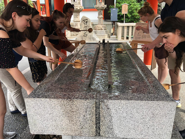 Trotz knapp 24-stündiger Anreise und Zeitumstellung besuchten wir noch am ersten Tag den bekannten Ikuta-Schrein und lernten dort das traditionelle Säubern vor dem Beten.
