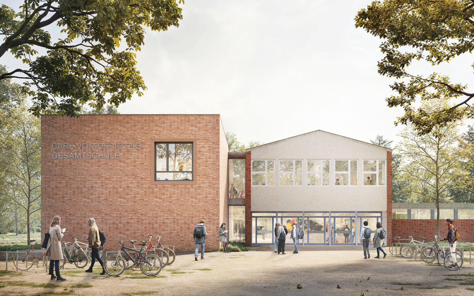 Die Baukörper bilden ein "U", das sich zum angrenzenden Park hin öffnet. Künftig sollen hier die Jahrgangsstufe 10 der Sekundarstufe I sowie die Jahrgangsstufen 11 bis 13 der gymnasialen Oberstufe der Gesamtschule unterrichtet werden. Zur Sicherstellung des Schul- und Vereinssports werden wir das bestehende Sporthallengebäude zurückbauen und durch eine neue Einfeldsporthalle ersetzen.