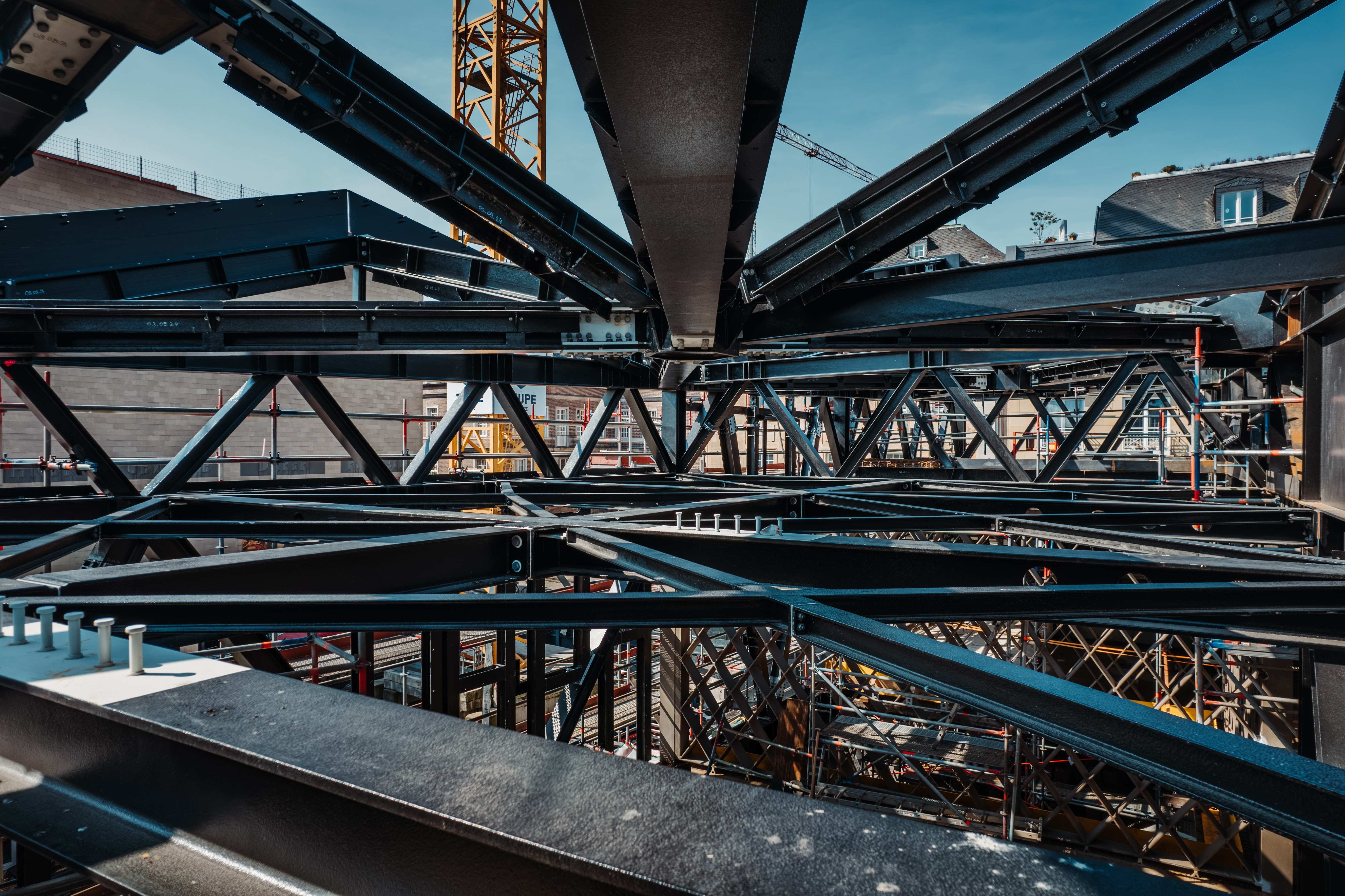 Im Juni 2023 gelangte die letzte Stahl-Raute in Millimeter-Arbeit mit Hilfe zweier Kräne an seine endgültige Position und vollendete damit das Erdgeschoss. Im Herbst 2024 schloss die Firma schließlich die Stahl-Hülle des Gebäudes mit den letzten Elementen. Im September 2024 haben wir dann die Geschossdecken betoniert. Anschließend haben wir damit begonnen, Dämmung auf die Stahlbaufassade zu bringen. Somit sind nun die eigentlichen Stahlbauarbeiten abgeschlossen.