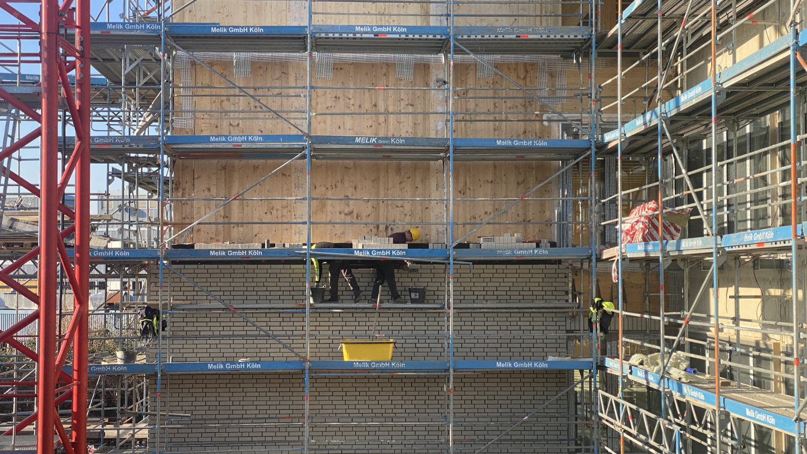 Den Rohbau für das Schulgebäude und die Sporthalle haben wir fristgerecht fertiggestellt. Der Innenausbau der Lernhäuser hat begonnen. Die Gewerke für die technische Gebäudeausrüstung und Trockenbau sind in vollem Gange. Der Estrichleger ist bereits im vierten und letzten Lernhaus unterwegs. Im vierten Haus sind bereits die Klinkerarbeiten für die Fassade beendet und die Fensteranlagen in weiten Teilen montiert. Über einer Tiefgarage haben wir eine Zweifach- und eine Dreifachturnhalle übereinander errichtet. Der Dachstuhl ist bereits fertig, auch hier läuft der Innenausbau auf allen Etagen. Die neue Schule wird in Teilen bunt. Die farbig glasierten Klinker sind im Bereich der Aula und der Sporthalle schon in großen Flächen verbaut worden.