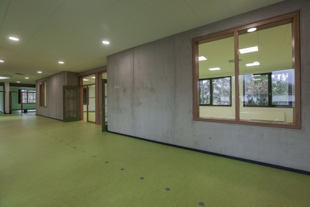 Das Gebäude wurde massiv und in Anlehnung an den Passivhausstandard erstellt. Optisch passt es sich mit seiner grauen Putzfassade an die bereits vorhandenen Schulgebäude an. In dem zweigeschossigen Gebäudeteil sind die Unterrichtsbereiche für die Sekundarstufe II untergebracht, im eingeschossigen Teil der Ganztagsbereich.