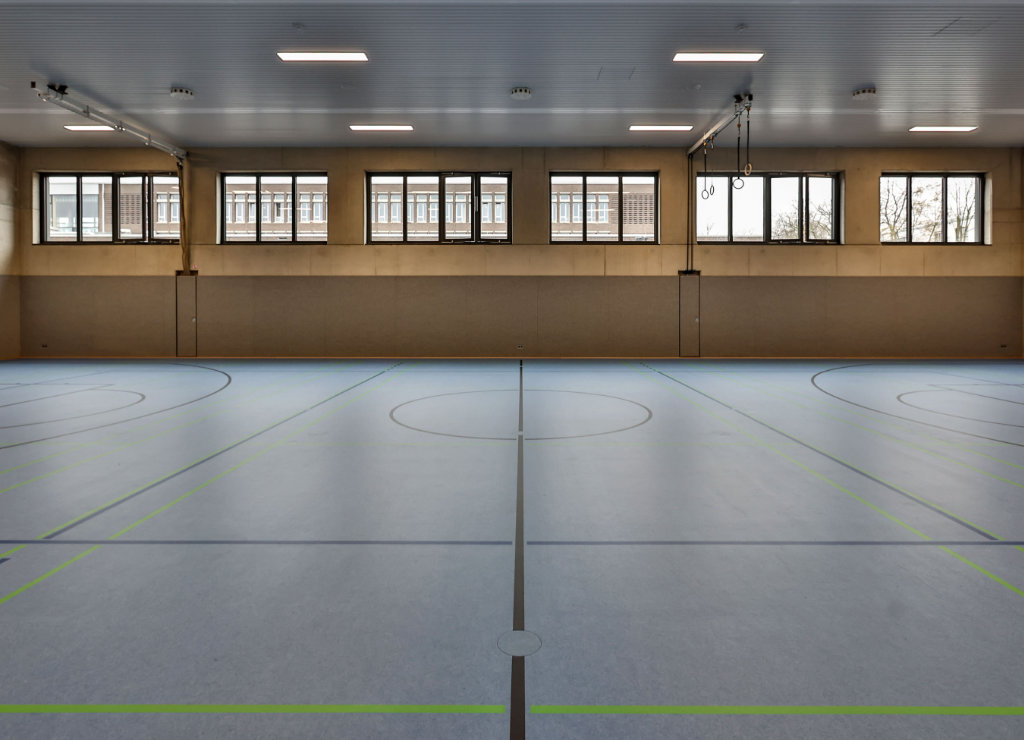 Die Gesamtschule in Rodenkirchen ist gewachsen. Für sie haben wir im März 2023 auf einem angrenzenden Grundstück an der Sürther Straße 191 einen Erweiterungsneubau sowie eine weitere Turnhalle fertiggestellt. Die Erschließung des Neubaus erfolgt über eine große Eingangshalle. Das Gebäudeinnere ist über einen Vorplatz, der in ein großzügiges Foyer führt, erreichbar. Die neue Einfachturnhalle mit einer Nutzfläche von rund 700 Quadratmetern liegt nahe der bereits vorhandenen Turnhallen, sodass zur Nutzung ein Betreten des Schulgrundstücks nicht notwendig ist und die Halle auch ortsansässigen Vereinen zur Verfügung gestellt werden kann.