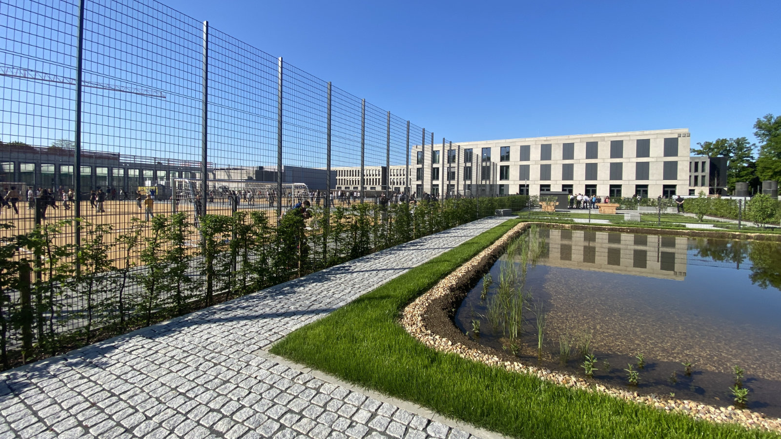 An der Willy-Brandt-Gesamtschule in Höhenhaus haben wir einen weiteren Bauabschnitt fertiggestellt und an die Schule übergeben: Am 28. April 2025 stürmten Schüler*innen die ersten neuen Außenanlagen. Entstanden sind Sportplätze, Fahrradstellplätze, erste Grünflächen, einen Teich mit Seerosen sowie ein Schulgarten mit Kräutern, der auch als grünes Klassenzimmer dient.
