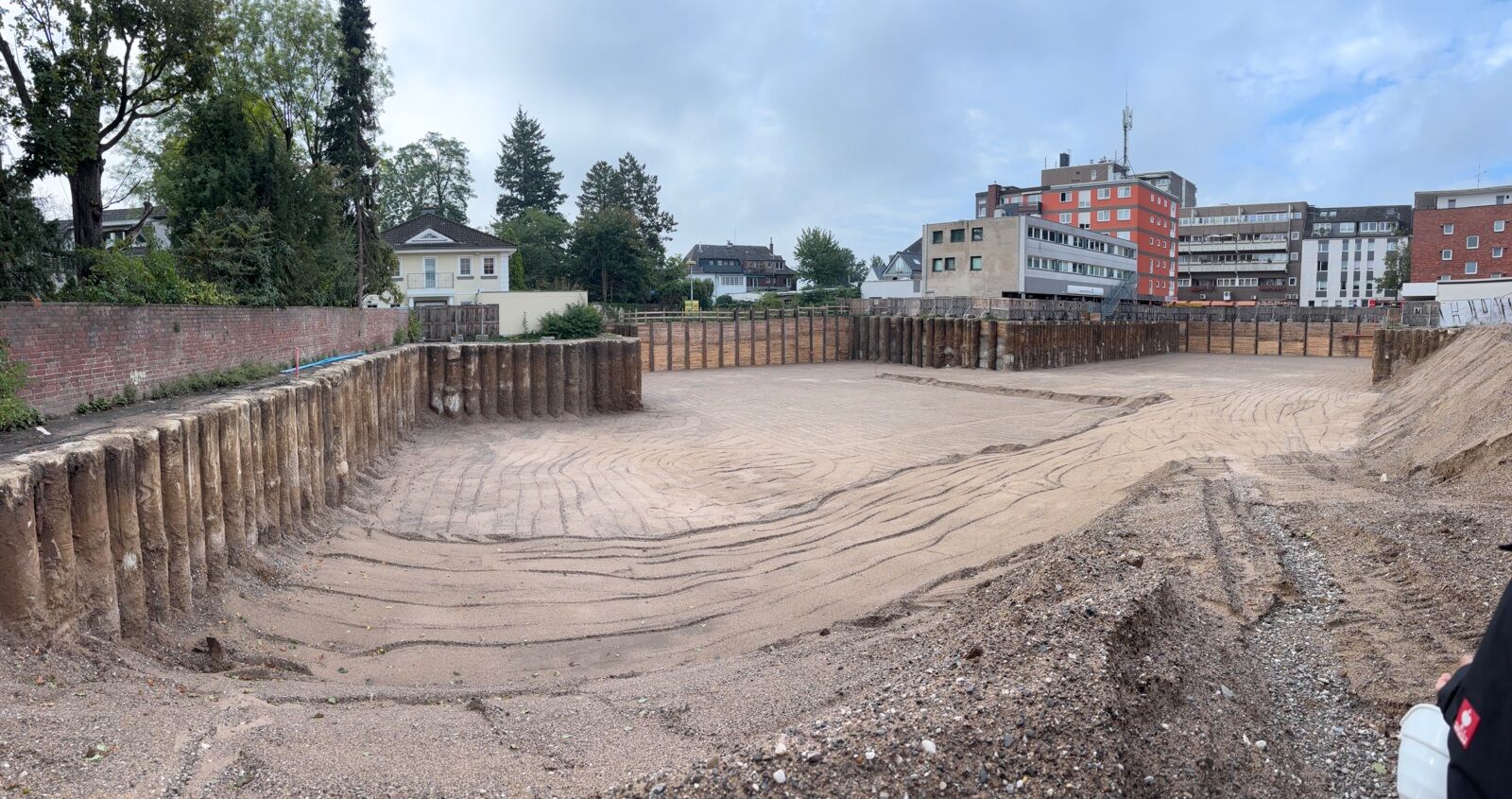 In Phase zwei haben wir den Verbau hergestellt, die Baugrube inklusive Tiefgarage ausgehoben und den unterirdischen Abbruch abgeschlossen. Mit Beginn der Phase zwei haben wir den Parkplatz an der Hauptstraße gesperrt und weitere Kampfmitteluntersuchungen durchgeführt. Diese blieben ohne Befund. Der Bauzaun wurde bis an den Gehweg der Hauptstraße versetzt. Im Anschluss haben wir begonnen, den vorderen Parkplatz zu entsiegeln, um ihn bodendenkmalpflegerisch zu erkunden. Während der archäologischen Arbeiten durch das Römisch-Germanische Museum wurden Überreste einer Hofanlage aus dem 19. Jahrhundert gefunden, freigelegt und dokumentiert. Im Anschluss daran erfolgten die Verbauarbeiten und der Aushub der Baugrube von der Hauptstraße bis zum verfüllten Keller des ehemaligen Rathausgebäudes. Hierauf folgte der Abbruch des Kellers, und die Baugrube wurde für die letzte Phase vorbereitet. Den Bauantrag hat das Generalplanungsteam am 4. April 2024 digital eingereicht. Die Baugenehmigung haben wir am 24. Februar 2025 erhalten.