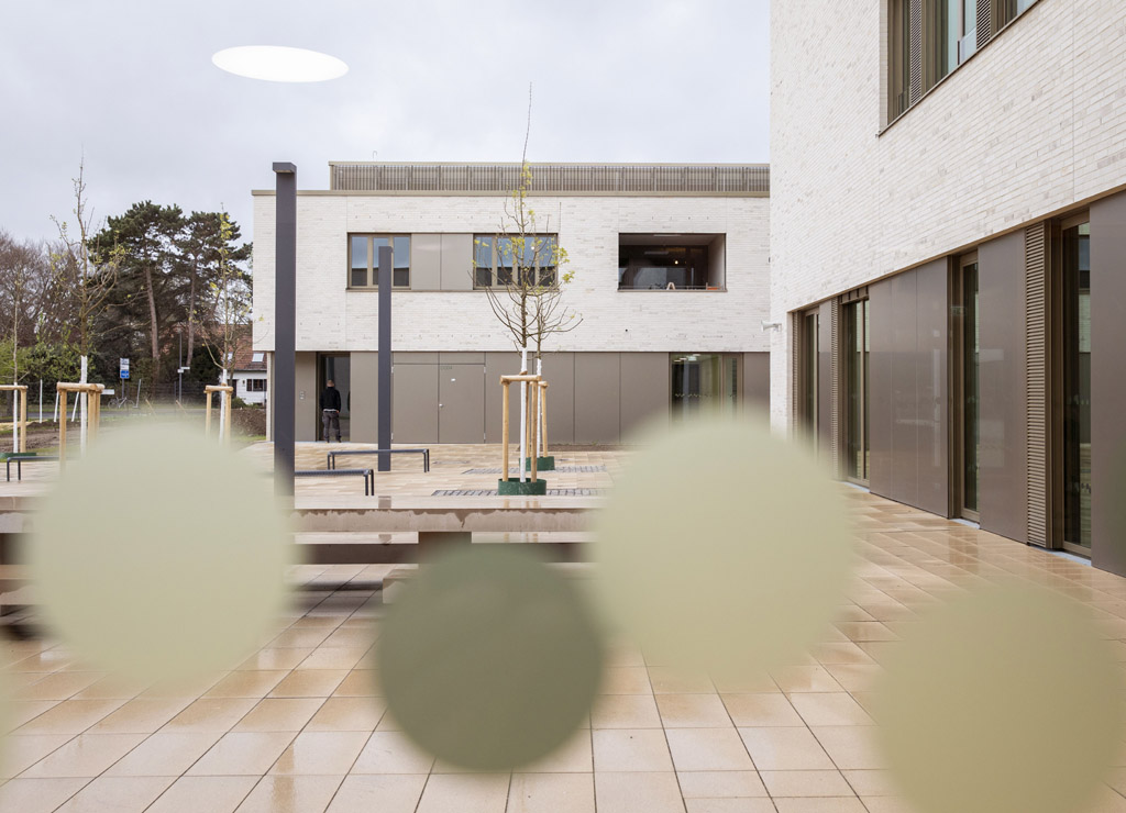 Die fünfzügige Grundschule mit Zweifachturnhalle – auch zur Vereinsnutzung – besteht aus drei Bauteilen. Durchgehende Lichthöfe im Innenbereich, versehen mit einer großen Lichtkuppel, bringen viel natürliches Licht in die Gebäude. Durch eine warme und ansprechende Farbgebung entsteht eine hohe Aufenthaltsqualität. Herz der Schule bilden eine Mensa und eine Aula mit kleiner Bühne.