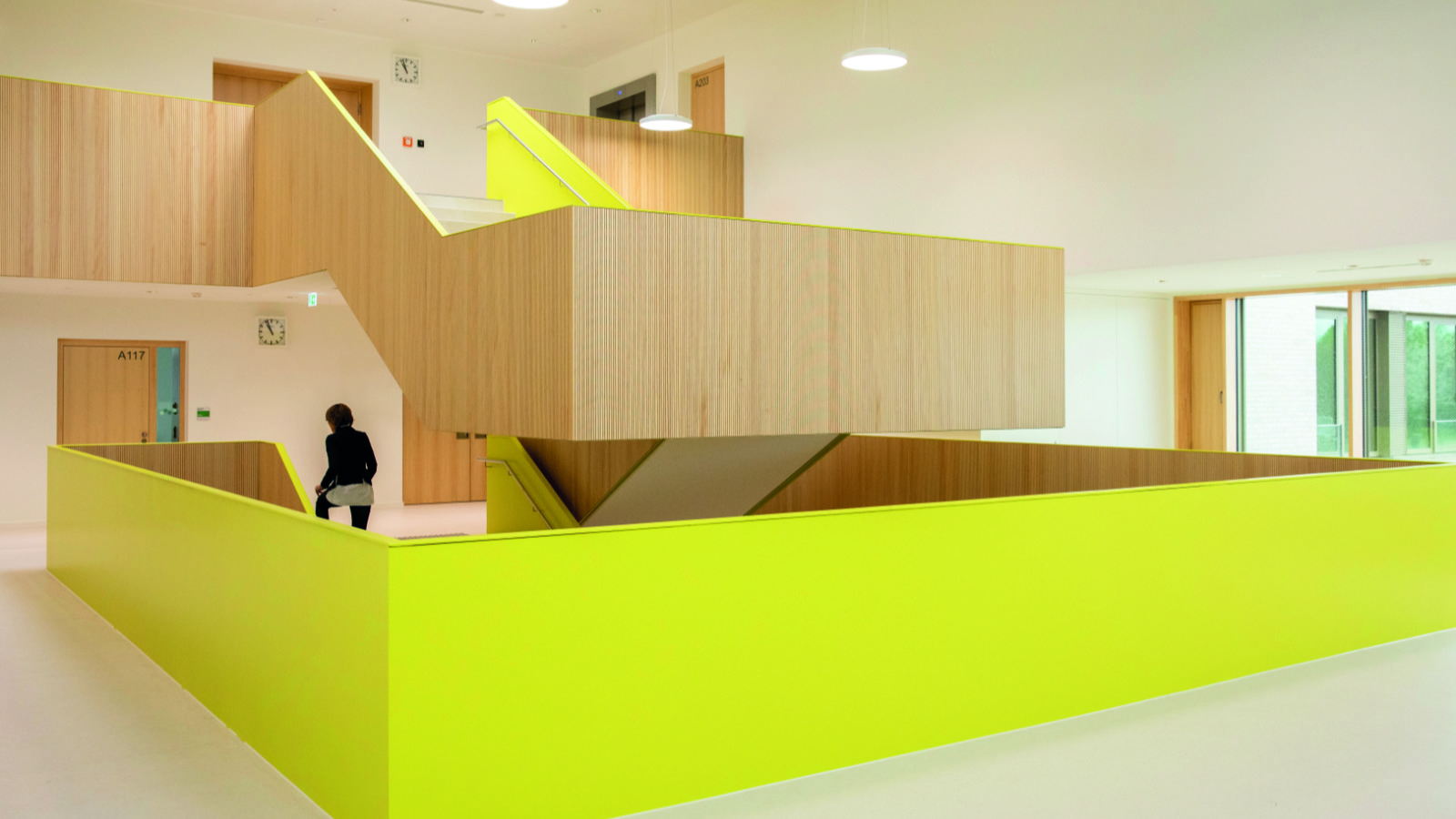 Eine großzügige und markante Treppe führt ins Obergeschoss. Gelernt wird nicht nur in den Klassenräumen, sondern auch in offenen Lernbereichen, die mit den Klassen so genannte Jahrgangs-Cluster ergeben. Cluster sind Raumgruppen, in denen Lern- und Unterrichtsräume gemeinsam mit den zugehörigen Differenzierungs-, Aufenthalts- und Erholungsbereichen eine Einheit bilden. Sie dienen als variabel nutzbare, zentrale Lernlandschaften für die jeweilige Jahrgangsstufe. Im Raumkonzept wurden insbesondere auch Therapie- und Krankengymnastik-Räume zur Unterstützung der psychomotorischen Aspekte berücksichtigt, da es sich bei der Emanuel-Schule um eine Schule des Gemeinsamen Lernens mit dem Schwerpunkt auf Integration von Kindern mit und ohne besonderen Förderbedarf handelt.