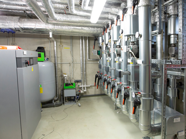 Der dreigeschossige Bau mit Dreifachturnhalle für rund 1.000 Schüler*innen verfügt über eine Grundwasserwärmeheizung mit einer eigenen, hocheffizienten Wärmepumpenanlage. So können wir sowohl das Schulgebäude als auch das Wasser für die Duschen der Turnhalle komplett mit Erdwärme auf Temperatur bringen. Dazu nutzen wir das natürlich vorkommende hohe Energieniveau des Grundwassers. Eine Pumpe führt das etwa 8 bis 12 Grad Celsius warme Wasser zu einem Wärmetauscher, der die Wärme an ein Kältemittel mit sehr niedrigem Siedepunkt überträgt. Dieser Kältemitteldampf wird mittels eines Kompressors auf hohen Druck gebracht, wobei die Temperatur auf Heizniveau von 35 bis 45 Grad ansteigt. Damit wird der Kreislauf der Fußbodenheizung erwärmt und die Umweltwärme optimal genutzt.