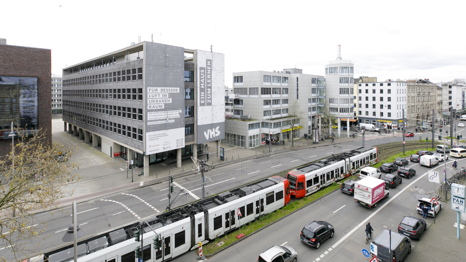 Zur Reinigung stickoxidbelasteter Luft in der Innenstadt haben wir gemeinsam mit der Stiftung "Lebendige Stadt" und dem Unternehmen Schüco ein Pilotprojekt durchgeführt. Dafür wurde Anfang 2024 an der Volkshochschule nahe dem Neumarkt eine stickoxidbindende Textilfassade installiert, die die Luft an der stark befahrenen Cäcilienstraße filtert. Die Fassade besteht aus recycelten Materialien, darunter über 4.400 PET-Flaschen und Aluminium mit 76 Prozent Recyclinganteil. Der Luftfilter besteht aus zwei bedruckten Membranflächen in der Größe von jeweils 8 mal 20 Metern und war mit einer Messtechnik ausgestattet. Durch die Messtechnik wurde die Luftqualität vor und hinter der Membran gemessen, um die luftreinigende Filterleistung auszuwerten und zu dokumentieren. Schädliche Stickoxidbestandteile der Luft wurden dabei durch die katalytische Beschichtung der textilen Bespannung in unschädliche Verbindungen umgewandelt.
