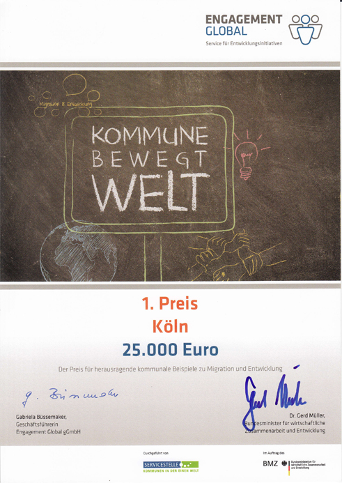 September 2014: Köln gewinnt den Wettbewerb "Kommune bewegt Welt – Preis für herausragende kommunale Beispiele zu Migration und Entwicklung"