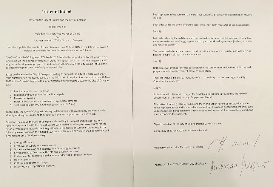 Das Zusammentreffen beim World Urban Forum im polnischen Katowice Ende Juni 2022 nutzten der stellvertretende Bürgermeister Andreas Wolter - in Vertretung von Oberbürgermeisterin Henriette Reker - und der Vizebürgermeister der Stadt Dnipro, Volodymyr Miller, zu einem ersten persönlichen Kennenlernen. Im Rahmen der Begegnung wurde basierend auf dem Ratsbeschluss auch der Letter of Intent (LOI) zur Vorbereitung und inhaltlichen Ausgestaltung der Projektpartnerschaft unterzeichnet.
