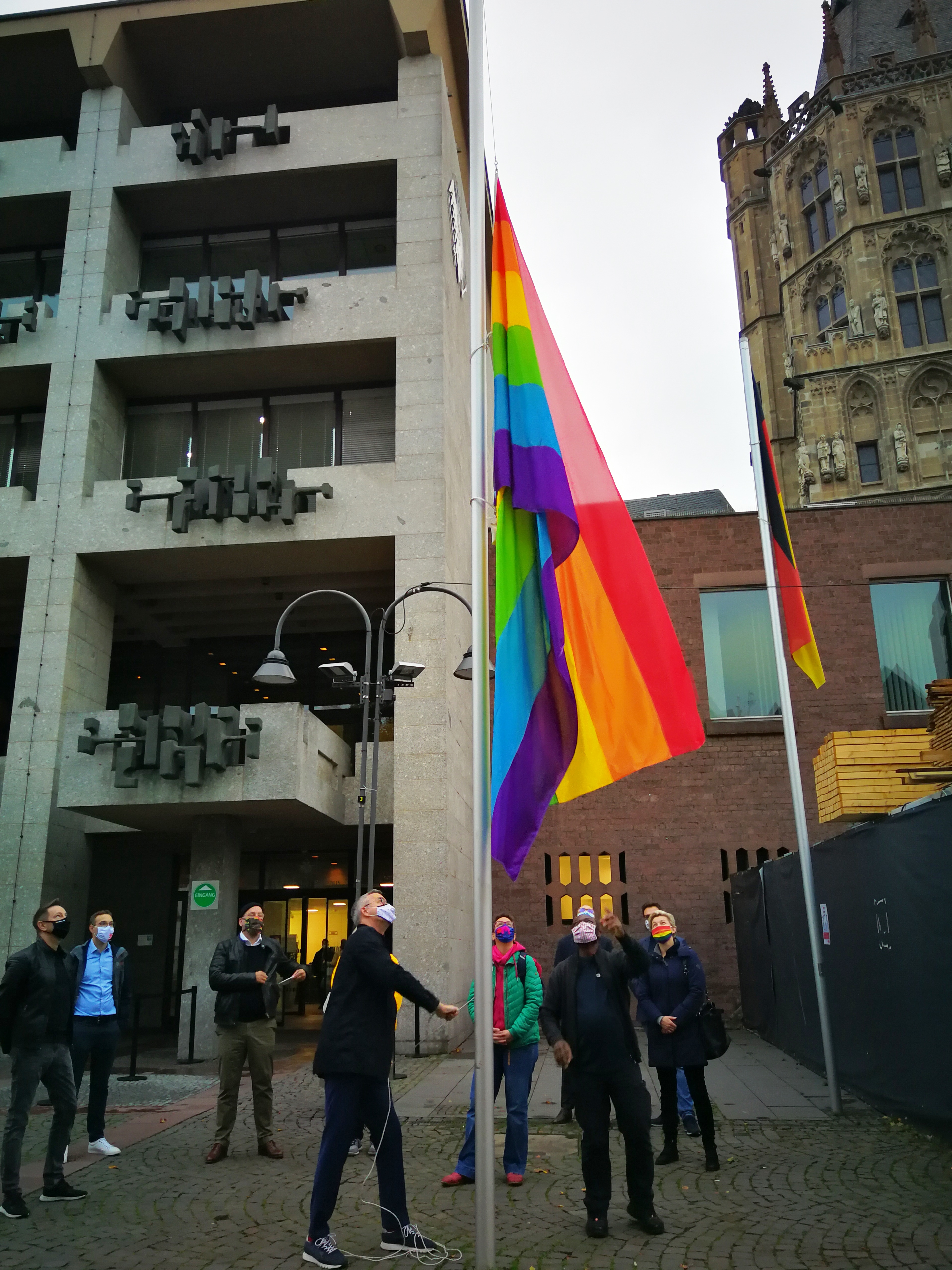 Zum Auftakt des Besuchs der dreiköpfigen Delegation aus Kattowitz stand das obligatorische Hissen der Regenbogenflagge vor dem Historischen Rathaus und die Begrüßung durch Bürgermeister Andreas Wolter (Die Grünen) in Vertretung von Oberbürgermeisterin Henriette Reker auf dem Programm.