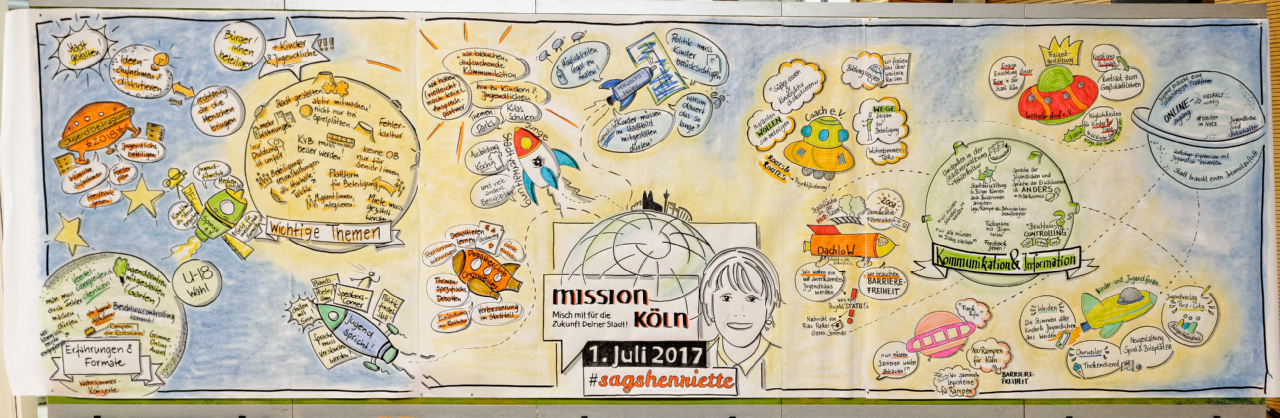 Bei der Veranstaltung "Mission Köln - Misch mit für die Zukunft Deiner Stadt" am 1. Juli 2017 konntet Ihr mit Oberbürgermeisterin Henriette Reker darüber sprechen, wie Ihr mehr an Entscheidungen der Stadt beteiligt werden wollt. Ihr wart zudem eingeladen, mit ihr über die Zukunft von Köln zu reden und zu verdeutlichen, was für junge Menschen wichtig ist.