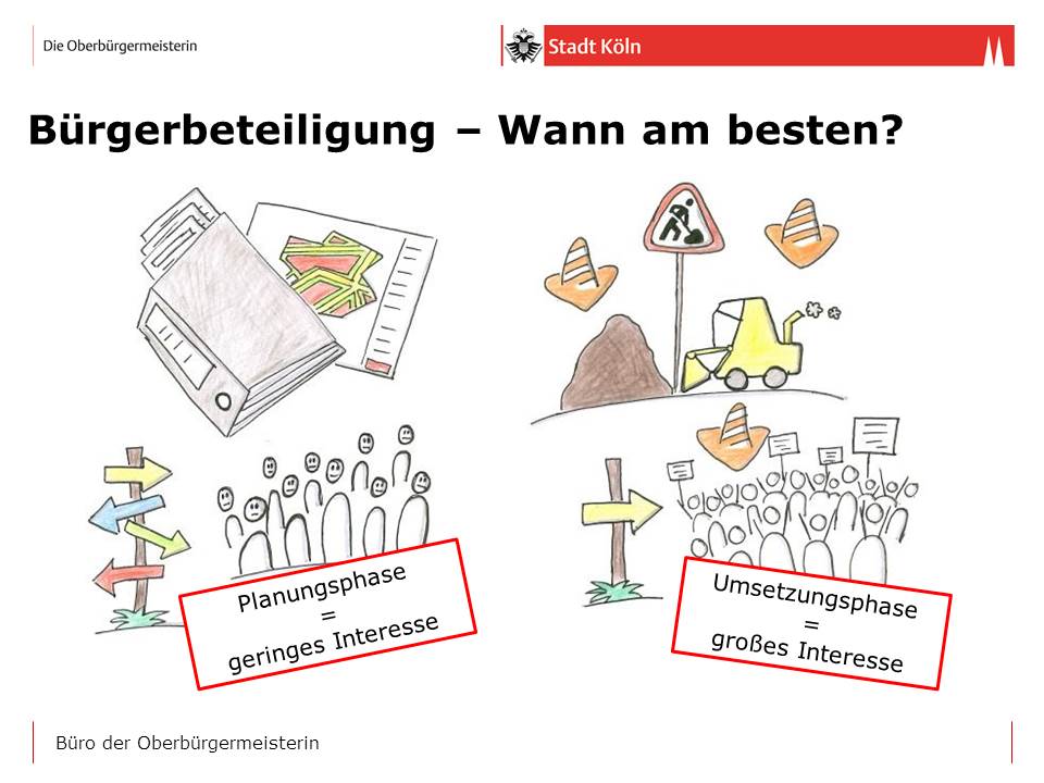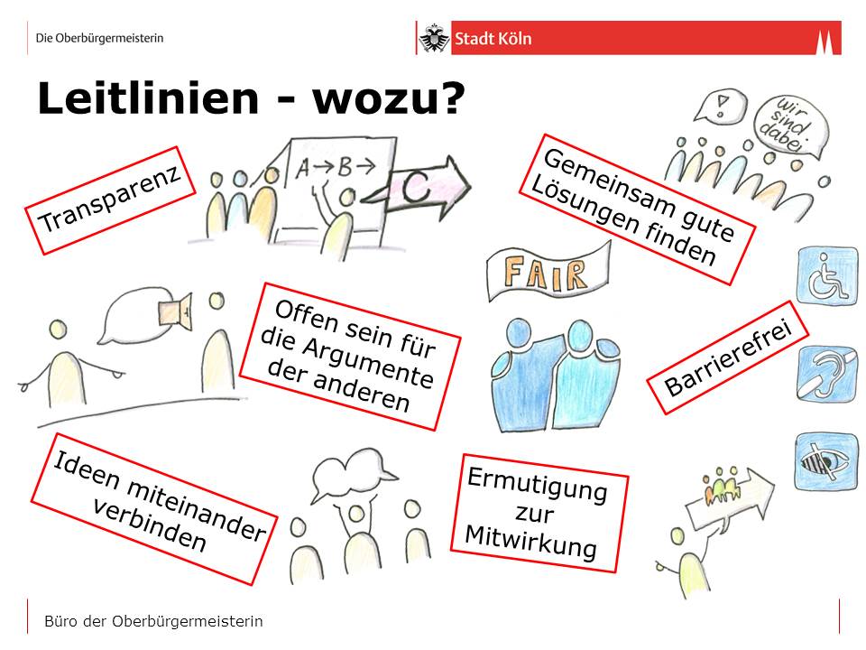 Wir erproben und entwickeln viele neue und moderne Beteiligungsformate, um den Bürger*innen passgerechte Mitwirkungsmöglichkeiten anzubieten, wie zum Beispiel den Bürgerhaushalt oder Ideenschmieden in Stadtentwicklungsgebieten. Sie unterliegen kaum gesetzlichen Vorgaben oder Qualitätsstandards. Damit diese neuen Formen der Bürgerbeteiligung als Bereicherung und Ergänzung zu den demokratisch legitimierten Diskussions- und Entscheidungsprozessen wirken können, braucht es allgemein anerkannte "Spielregeln", also ein verbindliches, allgemeingültiges Regelwerk, das bei der Planung, Durchführung und Auswertung aller Beteiligungsverfahren in Köln gilt.