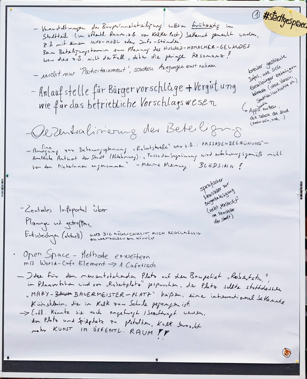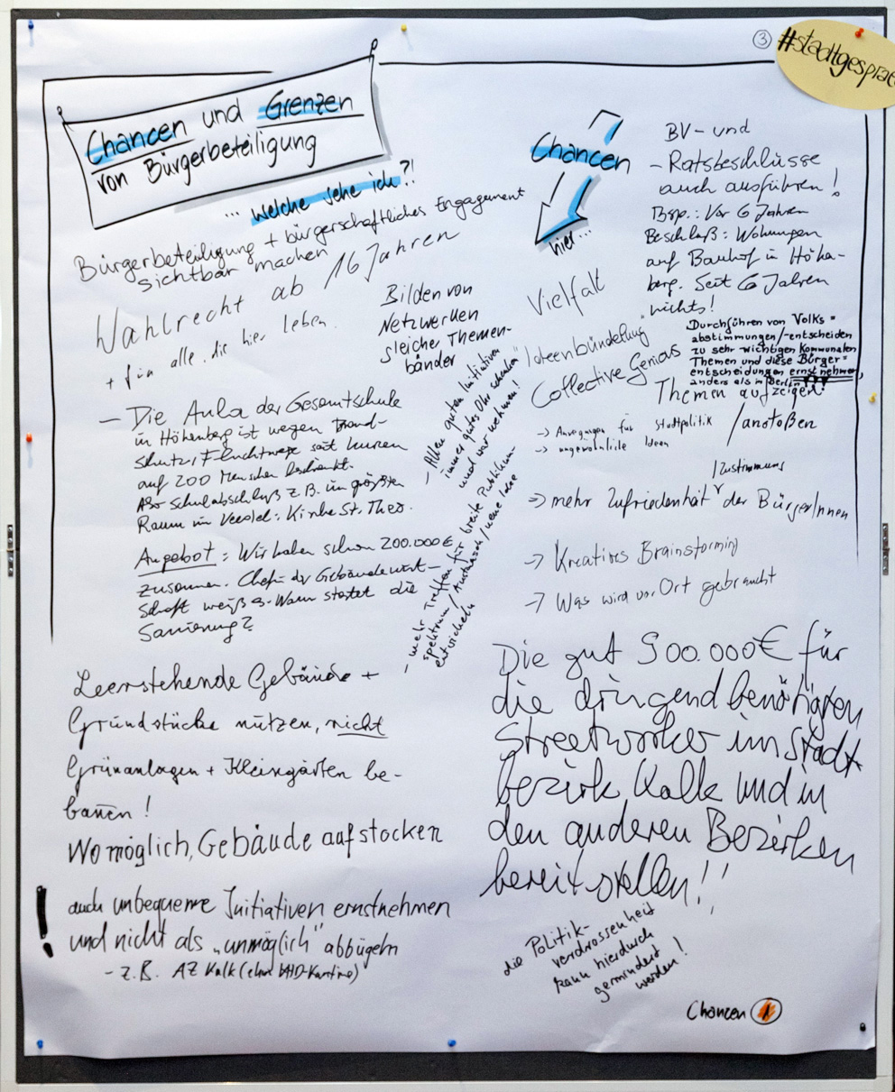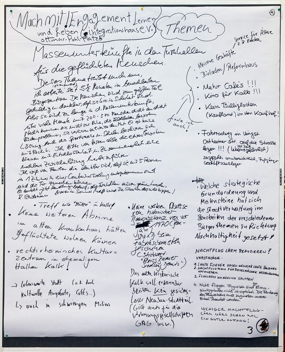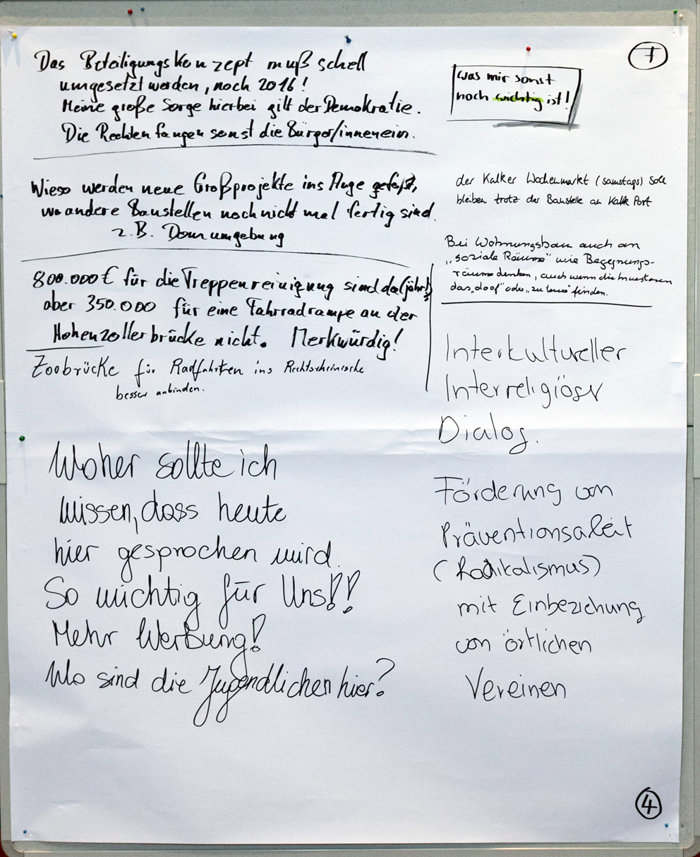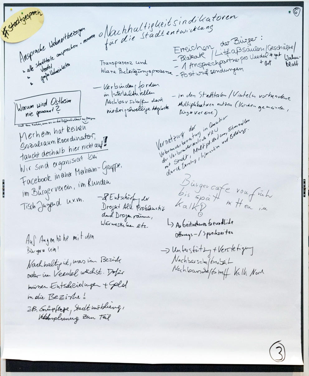 Auch beim zweiten Stadtgespräch im Bezirksrathaus Kalk konnten alle Interessierten in einem Workshop-Verfahren ihre Meinungen unter verschiedenen Rubriken zu Papier bringen. Wir haben Ihnen diese nachfolgend in einem PDF-Dokument zusammengestellt. Im Anschluss finden Sie außerdem die Fotoprotokolle der handschriftlichen Aufzeichnungen.