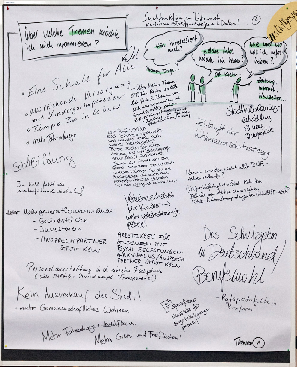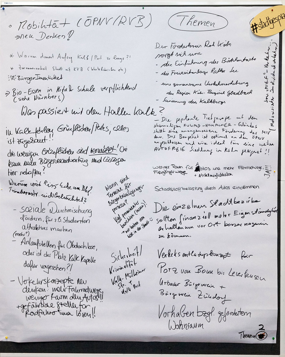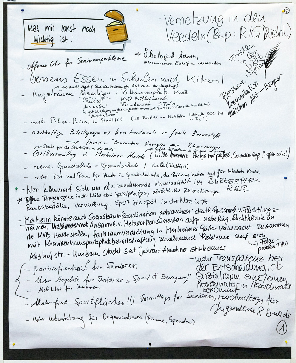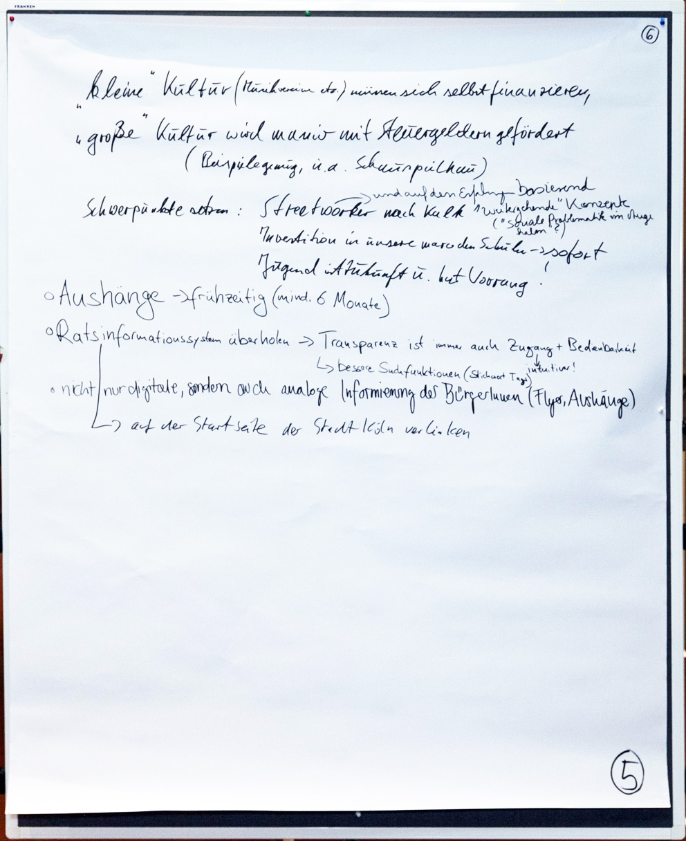 Auch beim zweiten Stadtgespräch im Bezirksrathaus Kalk konnten alle Interessierten in einem Workshop-Verfahren ihre Meinungen unter verschiedenen Rubriken zu Papier bringen. Wir haben Ihnen diese nachfolgend in einem PDF-Dokument zusammengestellt. Im Anschluss finden Sie außerdem die Fotoprotokolle der handschriftlichen Aufzeichnungen.