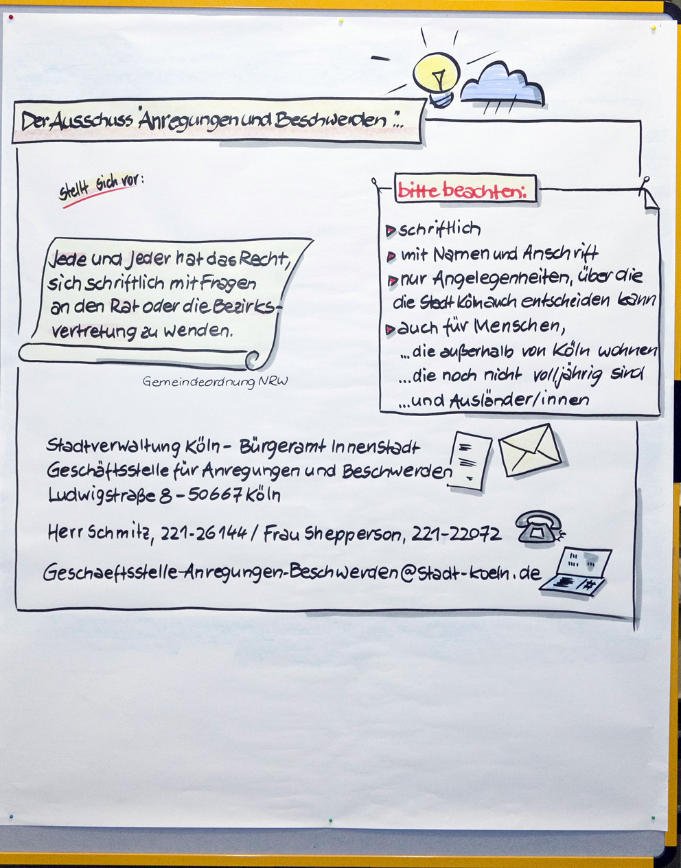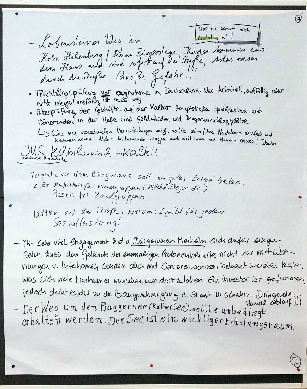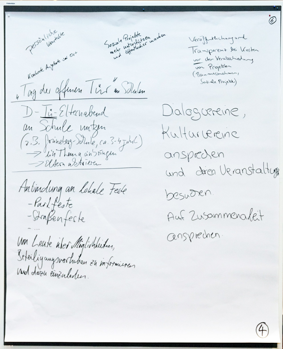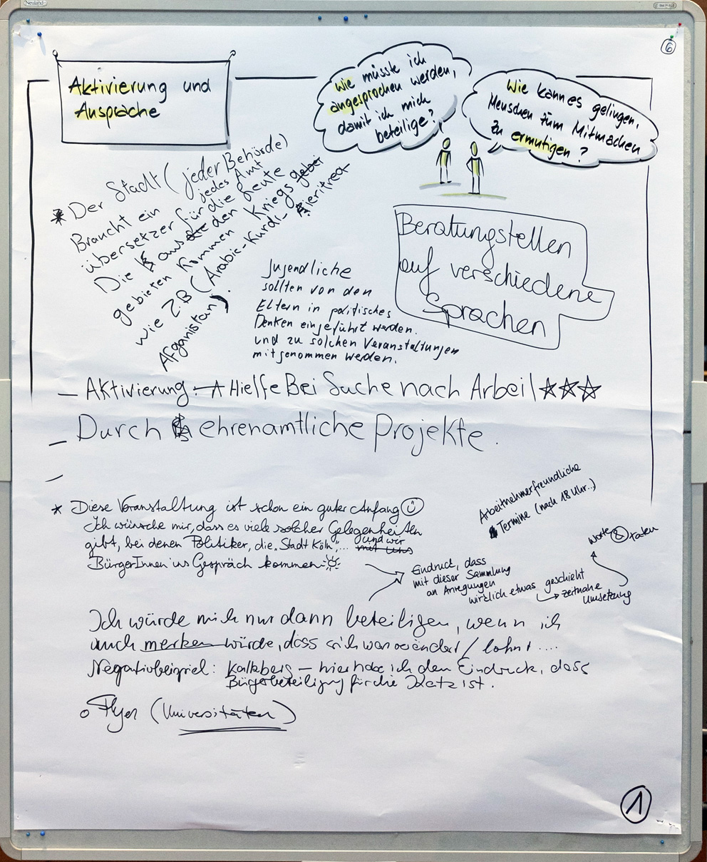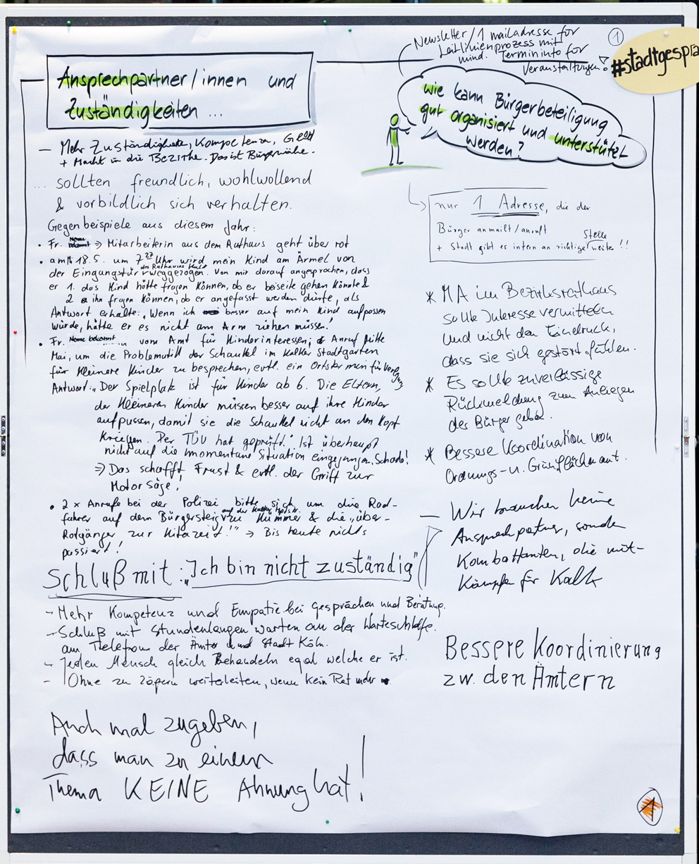 Auch beim zweiten Stadtgespräch im Bezirksrathaus Kalk konnten alle Interessierten in einem Workshop-Verfahren ihre Meinungen unter verschiedenen Rubriken zu Papier bringen. Wir haben Ihnen diese nachfolgend in einem PDF-Dokument zusammengestellt. Im Anschluss finden Sie außerdem die Fotoprotokolle der handschriftlichen Aufzeichnungen.