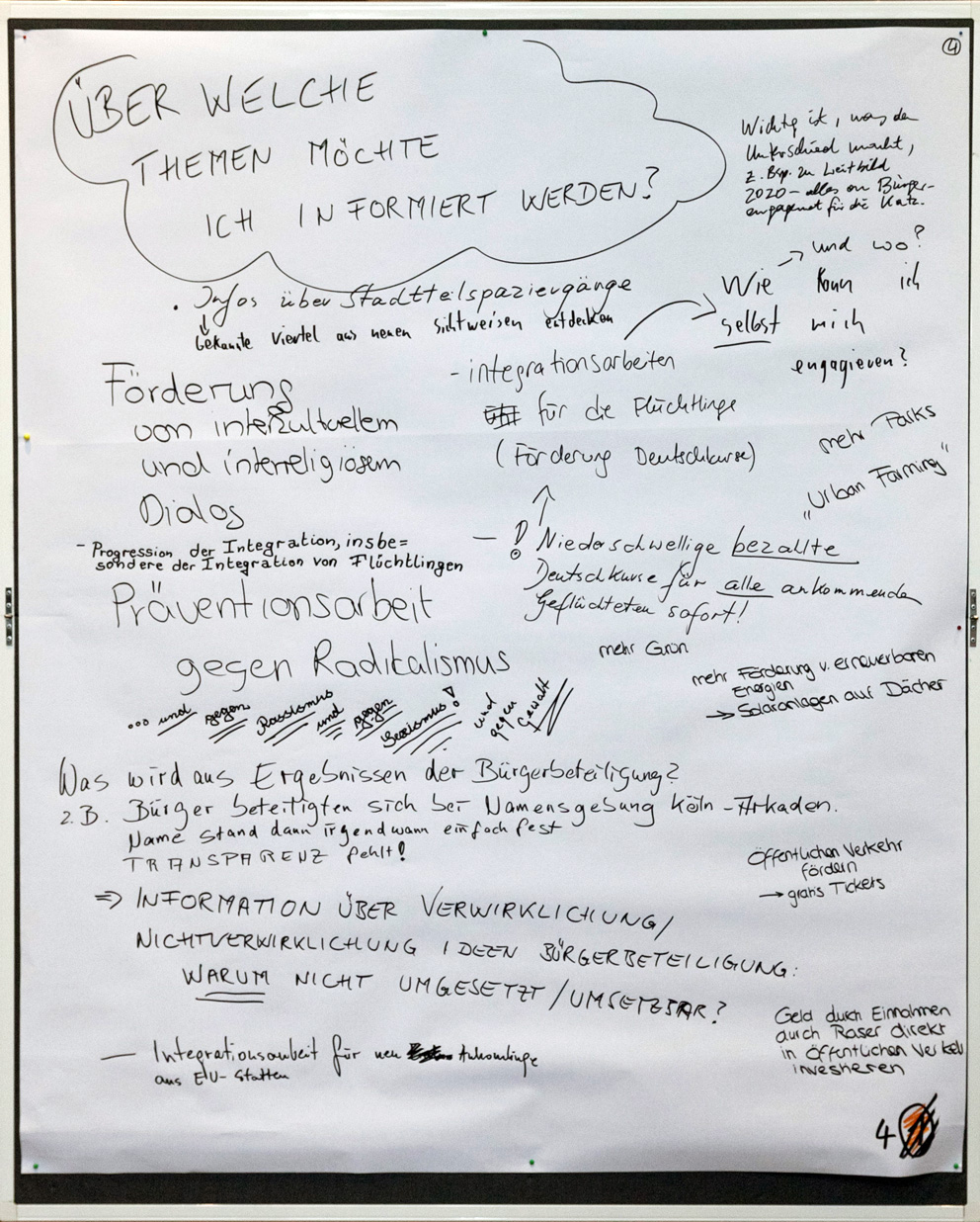 Neben speziellen Fragestellungen rund um das Thema "Bürgerbeteiligung" waren die Anwesenden auch aufgerufen, ganz konkrete Anliegen an der Stellwand "Weitere wichtige Themen" niederzuschreiben. Eine Liste mit Antworten und Maßnahmen zu den zusammengetragenen Punkten steht für Sie am Ende der entsprechenden Rubrik zur Verfügung.
