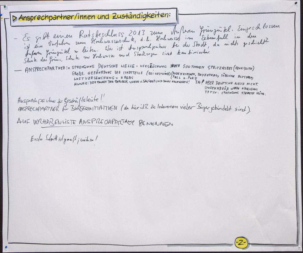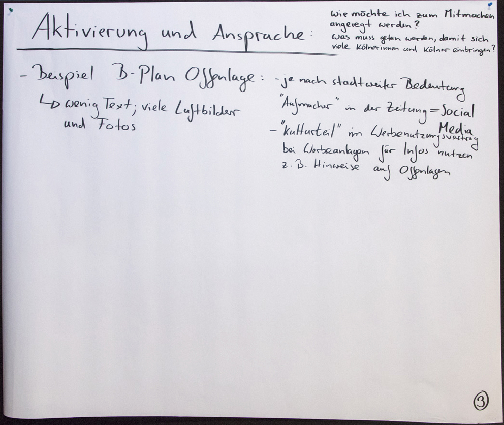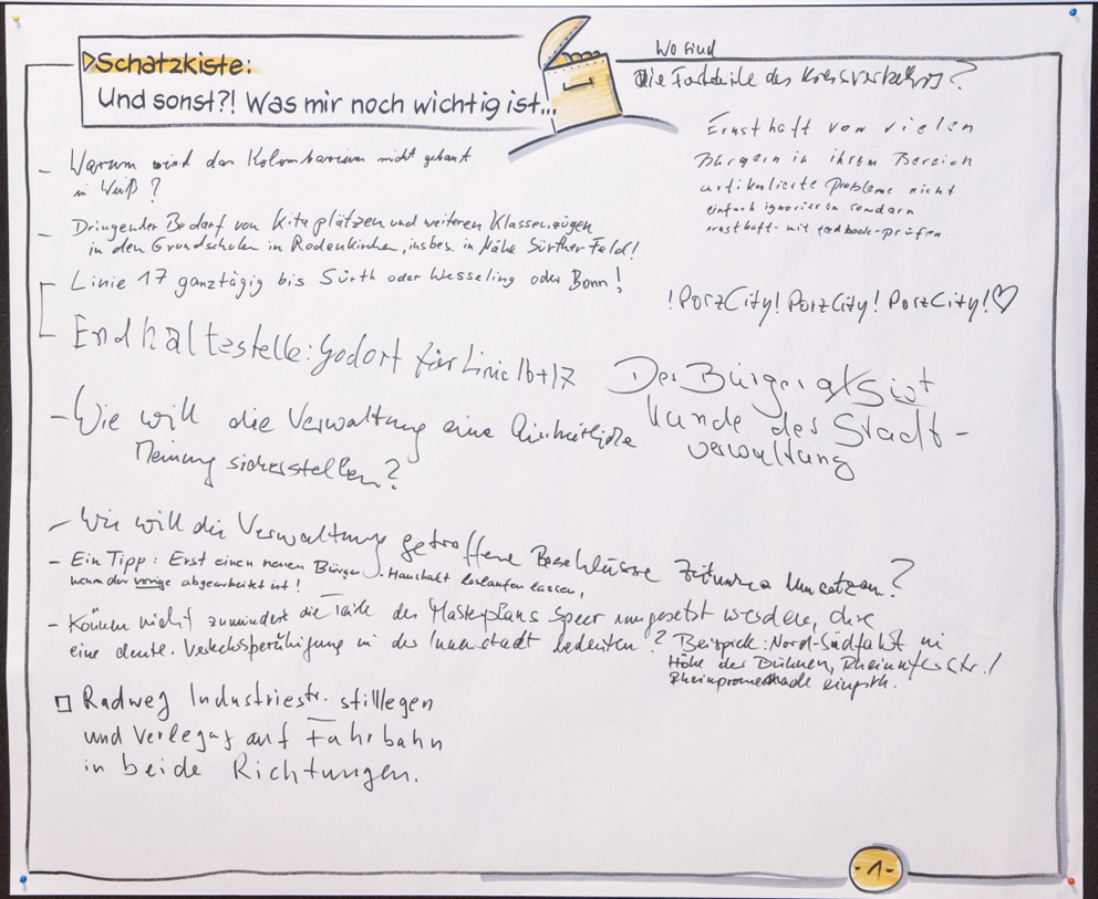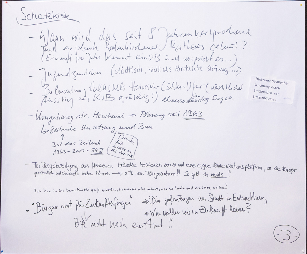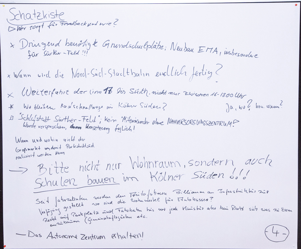 Beim sechsten Stadtgespräch in der Aula der Gesamtschule Rodenkirchen haben die Bürgerinnen und Bürger erneut eine große Menge interessanter Ideen und Anregungen beigesteuert. Wir haben Ihnen diese nachfolgend in einem PDF-Dokument zusammengestellt. Im Anschluss finden Sie außerdem die Fotoprotokolle der handschriftlichen Aufzeichnungen.