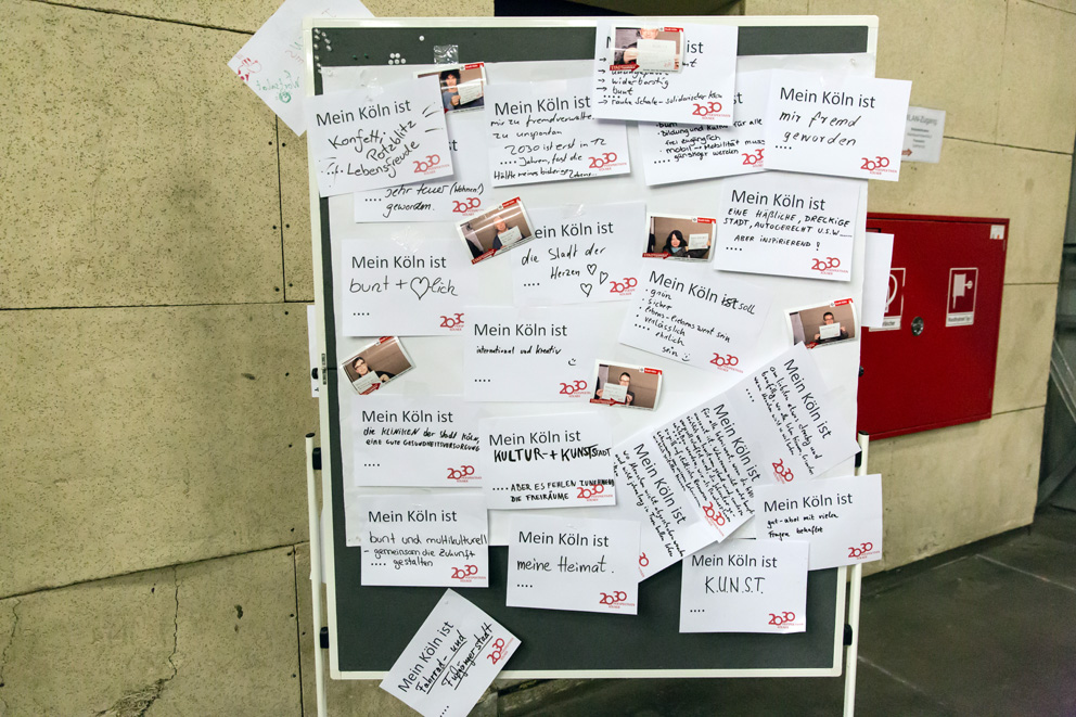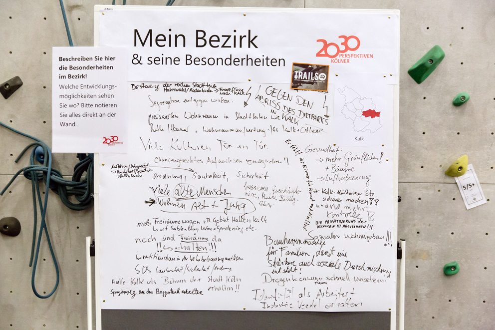 Etwa 200 Bürgerinnen und Bürger waren beim vierten Stadtgespräch zur Frage "Wie wollen wir in Köln 2030 leben?" in den AbenteuerHallenKALK zu Gast. Einen Überblick über deren Anregungen, Hinweise und Ideen verschafft das nachfolgende Fotoprotokoll.