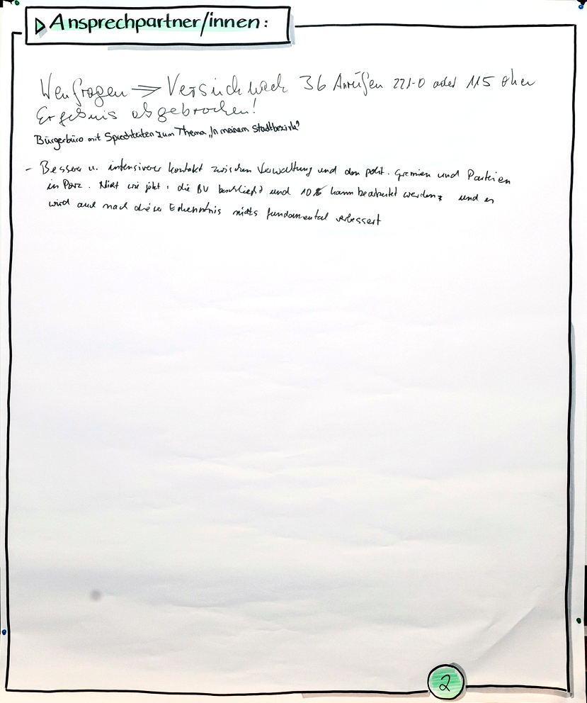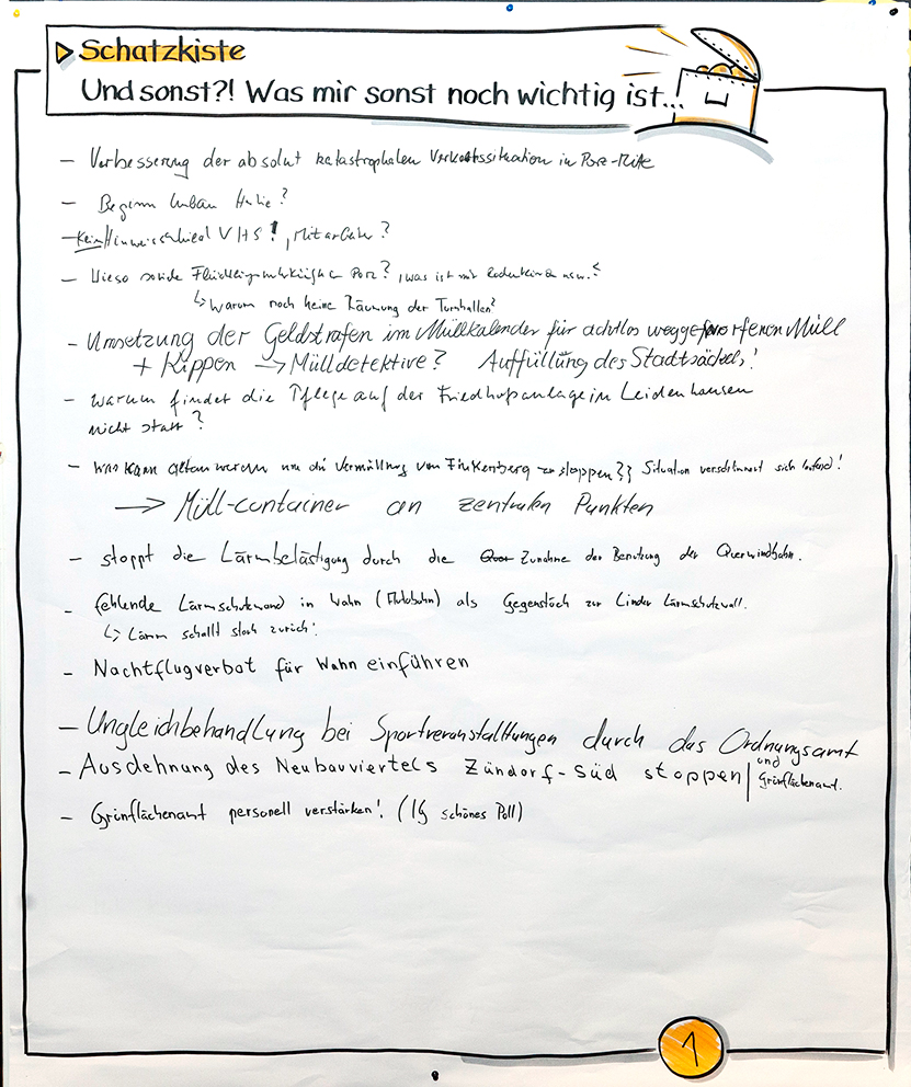 Neben speziellen Fragestellungen rund um das Thema "Bürgerbeteiligung" waren die Anwesenden auch aufgerufen, ganz konkrete Anliegen an der Stellwand "Weitere wichtige Themen" niederzuschreiben. Eine Liste mit Antworten und Maßnahmen zu den zusammengetragenen Punkten steht für Sie am Ende der entsprechenden Rubrik zur Verfügung.
