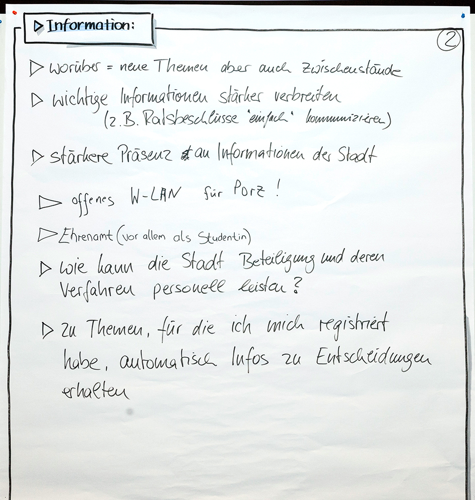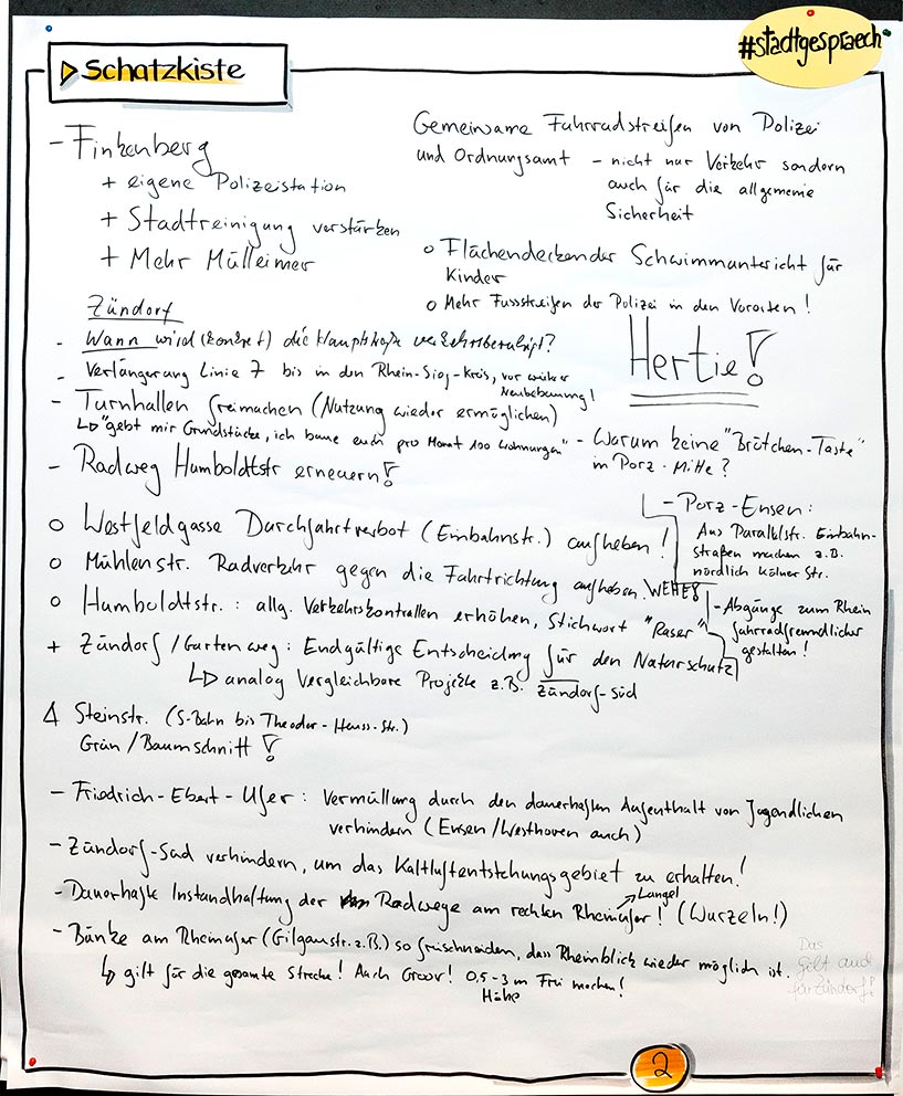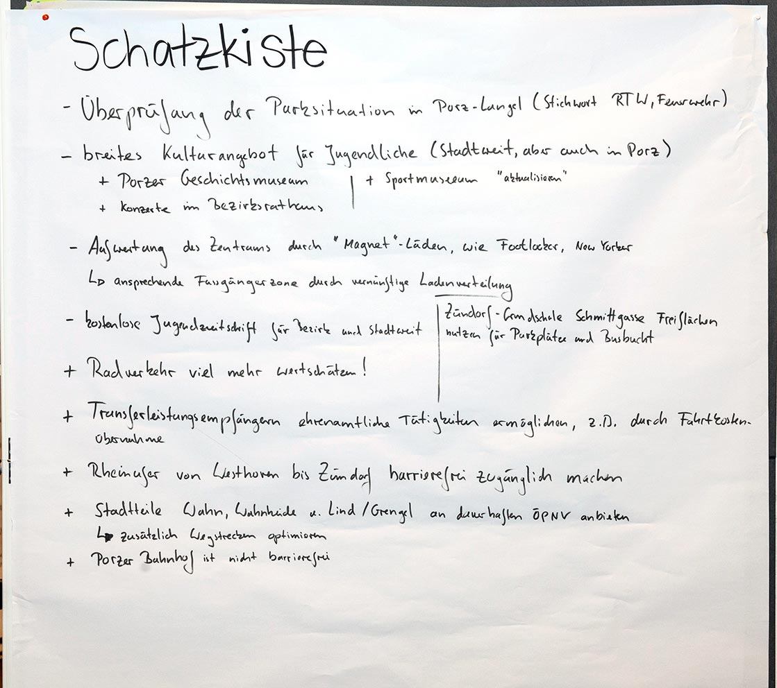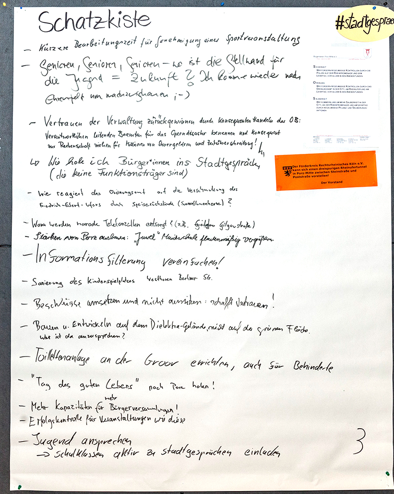 Beim dritten Stadtgespräch im Bezirksrathaus Porz haben wieder viele Interessierte in einem Workshop-Verfahren ihre Meinungen unter verschiedenen Rubriken zu Papier gebracht. Wir haben Ihnen diese nachfolgend in einem PDF-Dokument zusammengestellt. Im Anschluss finden Sie außerdem die Fotoprotokolle der handschriftlichen Aufzeichnungen.