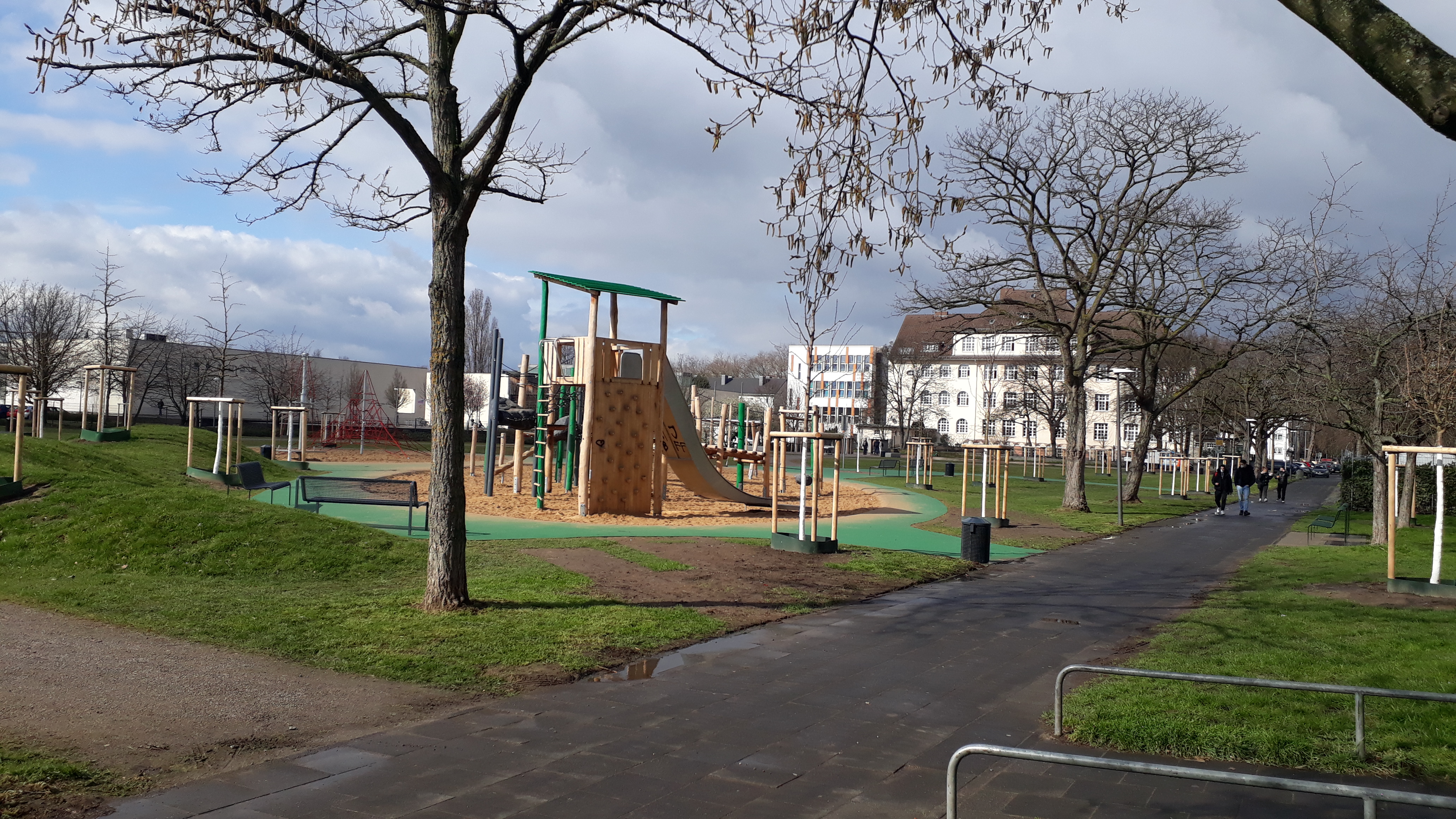 Die ökologische Revitalisierung und Neugestaltung entlang der Westerwaldstraße in Humboldt/Gremberg kann sich sehen lassen. Der lange Bauzaun entlang der rund 18.000 Quadratmeter großen Festwiese wurde entfernt – ein neuer Kinderspielplatz mit Lern-, Bewegungs-und Koordinationsangeboten ist entstanden. Für größere Kinder, Jugendliche und Erwachsene stehen jetzt ein Basketball-Platz, eine Tischtennisplatte und eine Boule-Fläche zu Verfügung. Zum neuen Freizeitangebot gehören auch ein Aussichtshügel mit Bänken und Trampolinen inmitten neuer Wege und Wiesen. Knapp 100 neue Bäume wurden gepflanzt, darunter auch Obstbäume wie Kultur- und Zierapfel, Pflaume, Birne, Kirsche und Walnuss.