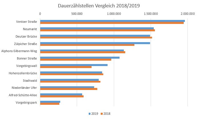 Im Jahr 2019 haben rund 12,8 Millionen Radfahrende die Dauerzählstellen der Stadt Köln passiert. Im Vergleich zum Vorjahr bedeutet dies eine Steigerung von rund drei Prozent. Berücksichtigt werden muss, dass die Zählstelle auf dem Vorgebirgswall erst im Mai 2018 eingeführt wurde.