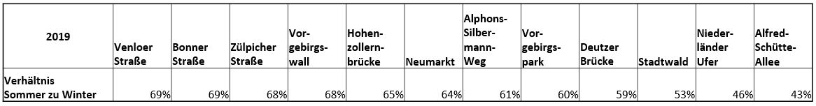Auffällig ist, dass der Wert in den Wintermonaten (Oktober bis März) im Vergleich zu den Werten aus den Sommermonaten je nach Zählstelle bis zu 70 Prozent erreicht. Das Fahrrad ist also längst ein Ganzjahres-Verkehrsmittel, das gerade von Pendlerinnen und Pendlern genutzt wird. Auf der Venloer Straße und der Bonner Straße betrug der Anteil im Winter im Vergleich zum Sommer beispielsweise jeweils 69 Prozent. Die aktuellen Daten der Fahrradzählstellen sind online öffentlich einsehbar.