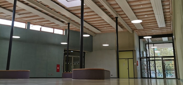 Lehrer*innenbereich und Sammlung haben getrennte Eingänge, sodass beide Bereiche unabhängig voneinander genutzt werden können. Zwei Eingangshallen dienen nicht nur als Zugang zum Gebäude, sondern auch als Aufenthaltsfläche für die Schüler*innen. Die Heizungsversorgung des Gebäudes erfolgt über klimaschonende Fernwärme, alle Dachflächen sind begrünt und die Innen- wie die Außenbeleuchtung mit energieeffizienten LEDs ausgestattet. Das Bauvolumen für die Gesamtmaßnahme liegt bei rund acht Millionen Euro.