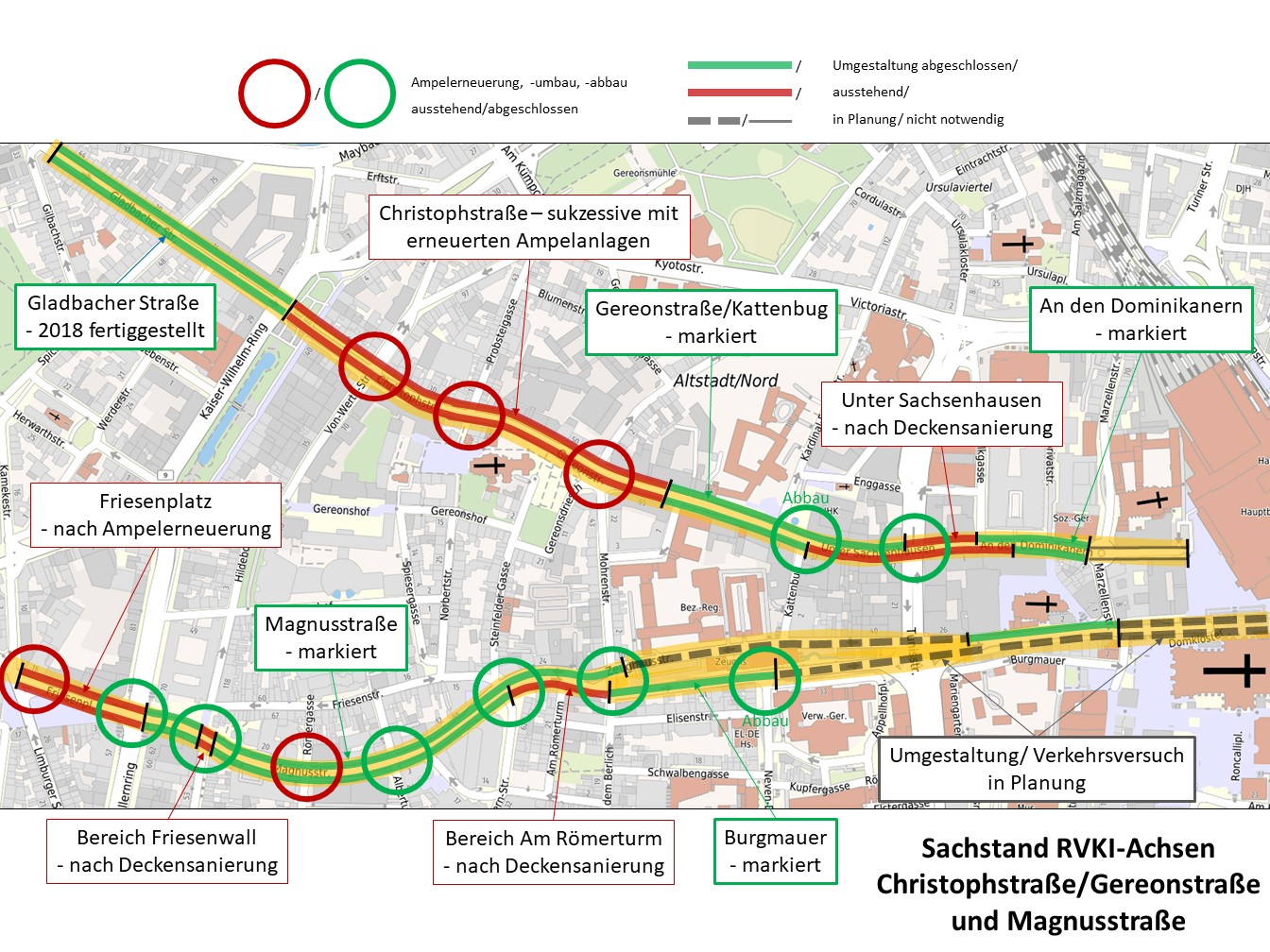 - Überwiegend Herstellung eines Radfahrstreifens mit einer Breite von 2,50 Meter (beinahe ausnahmslos auf der Achse Magnusstraße; auf der Achse Christophstraße zwischen Von-Werth-Straße und Börsenplatz), abschnittsweise Herstellung eines Radschutzstreifens (Achse Christophstraße zwischen Kaiser-Wilhelm-Ring und Von-Werth-Straße sowie zwischen Börsenplatz und Marzellenstraße)