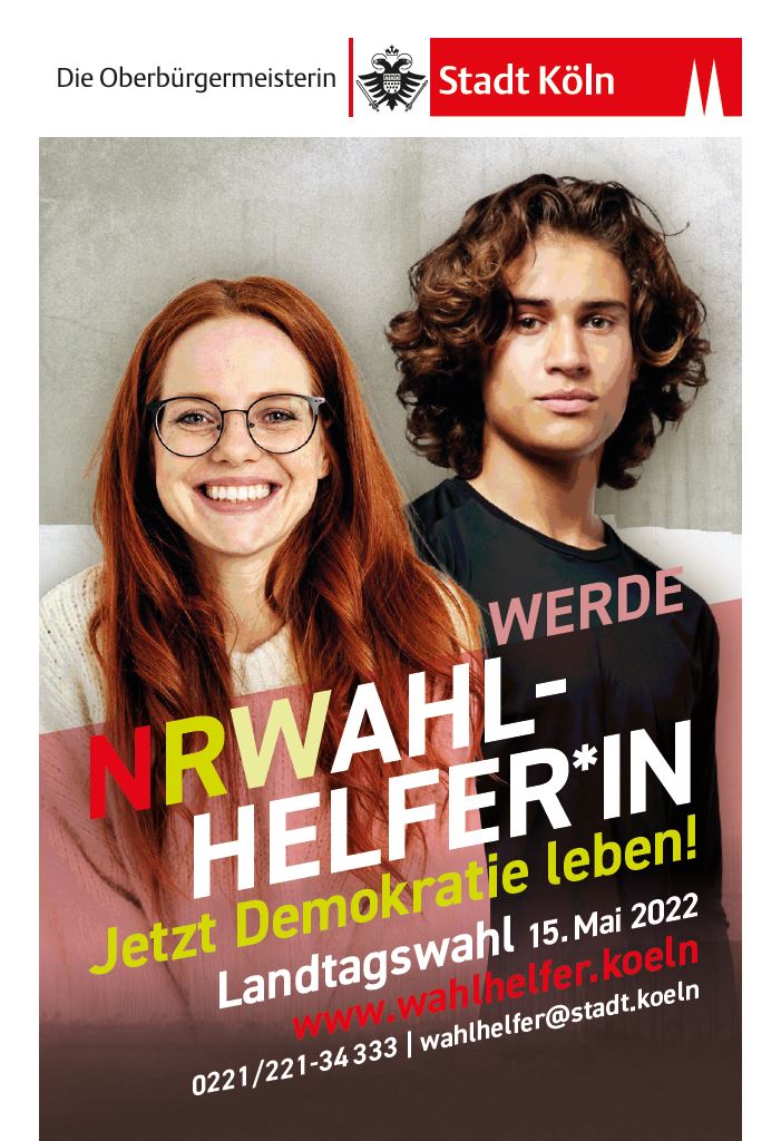 Am 15. Mai 2022 findet in Nordrhein-Westfalen die Landtagswahl statt, bei der die Abgeordneten des 18. nordrhein-westfälischen Landtags für die Dauer von fünf Jahren gewählt werden. Mit einer Werbekampagne auf den unterschiedlichen Kanälen (Plakate, Citylightposter, Megalightposter) wirbt die Stadt Köln nun dafür, sich als ehrenamtliche Wahlhelfer*innen zu engagieren.