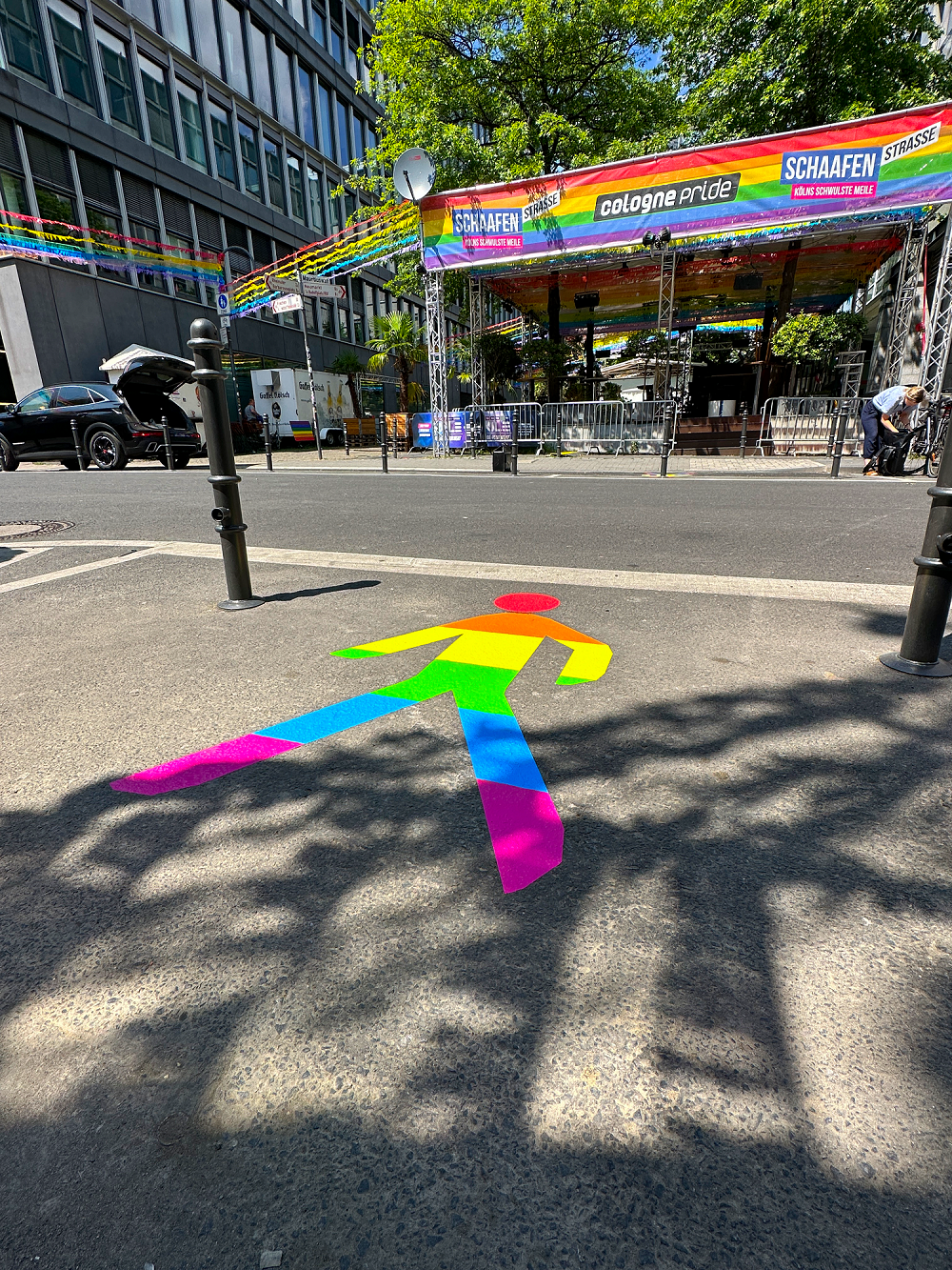 Auf der Schaafenstraße im Bereich des Mauritiuswalls hat die Stadt Köln erst kürzlich die Gehwege durch Markierungen verbreitert, damit Fußgänger*innen die Straße besser überqueren können. An den Querungsstellen wurden nun zusätzlich zeitlich befristete Figuren-Piktogramme in Regenbogenfarben mittels einer speziellen Klebefolie auf den Asphalt aufgebracht.