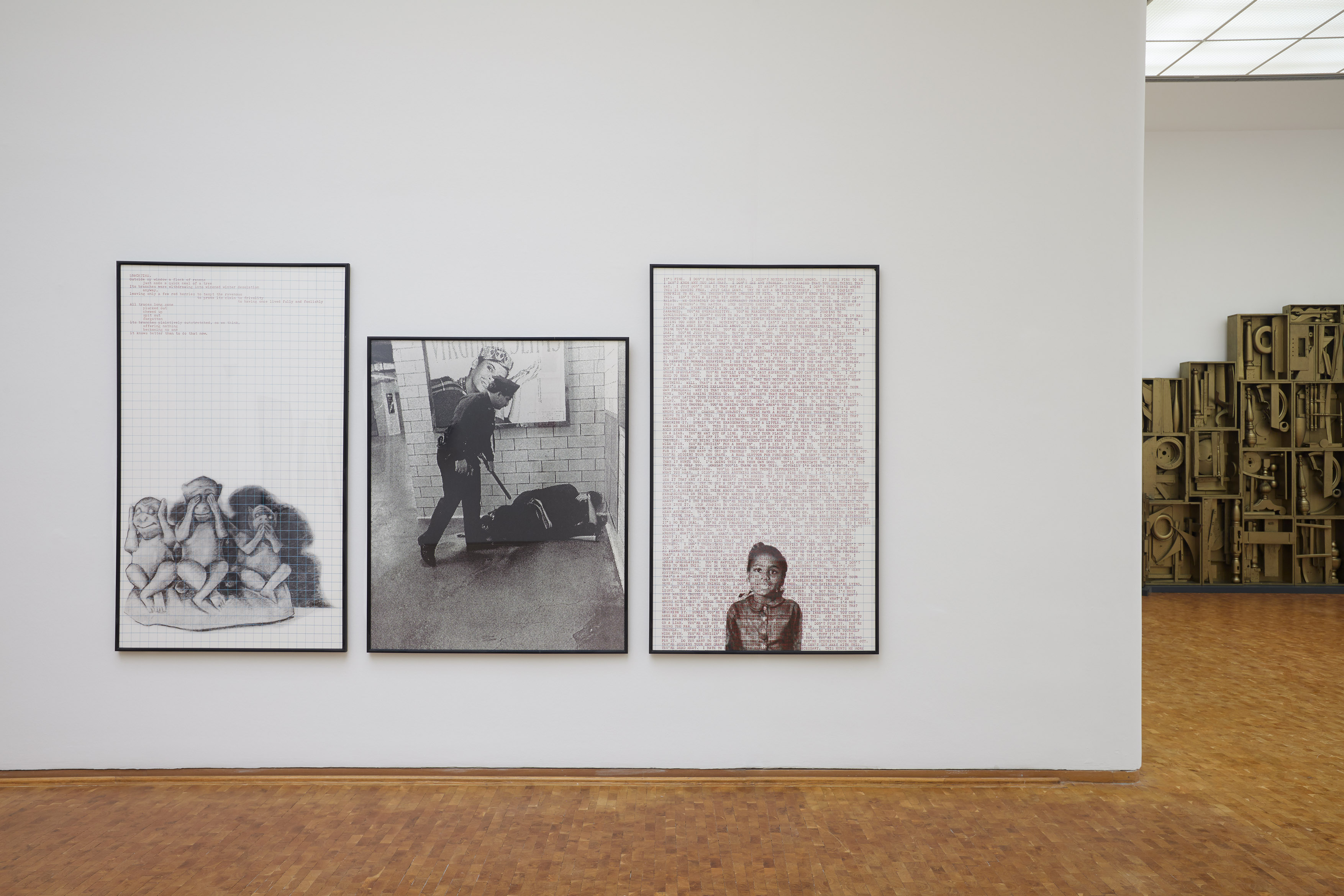 Die ein Jahr zuvor entstandene Installation "What It’s Like, What It Is #2.2" arbeitet mit ähnlichen künstlerischen Mitteln. Ein auf dem Boden aufgestellter Fotoausschnitt zeigt in Lebensgröße eine Gruppe weißer Frauen und Männer, die wütend schreien. Sie reagieren auf eine Demonstration von Afroamerikanern anlässlich der rassistisch motivierten Ermordung des 16-jährigen Yusef Kirriem Hawkins. Zweites Element der Installation ist ein Bewerbungsformular, auf das – zerteilt und in die Abteilungen des Formulars eingepasst – das gezeichnete Gesicht eines schwarzen Mannes gedruckt ist. Verbunden sind beide Elemente durch die aufgedruckten Wörter "Forget" und "it". Drittes Element ist der Soundtrack: "White Noise" von CD, ein grelles Rauschen, das die Artikulation spezifischer (Leidens-) Erfahrungen verschluckt und das hier – schon seines Namens wegen – weiße Dominanz akustisch verkörpert. "Decide Who You Are #13 Virtue und #31 Snacktime" waren zentrale Exponate der Ausstellung "Mapping the Collection", die das Museum Ludwig im Sommer 2020 gezeigt hat.