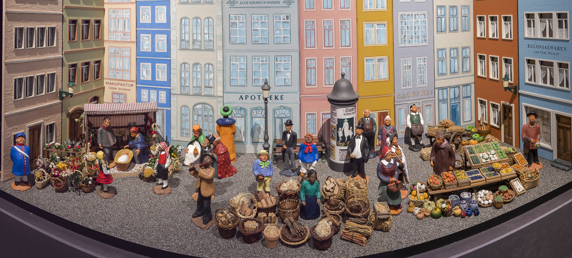 Hier kommt das Jesuskind in einem Blumenstand zur Welt, zwischen kunstvoll gestalteten Bürgerhäusern. Die Heilige Familie wird dabei umringt von kölschen Originalen. Unter den Figuren finden sich fiktive Kult-Charaktere wie die Stockpuppen-Held*innen Hänneschen und Bärbelchen, aber auch echte historische Stadtoriginale wie der exzentrische Maler Bock und der berüchtigte Läsche Nas.