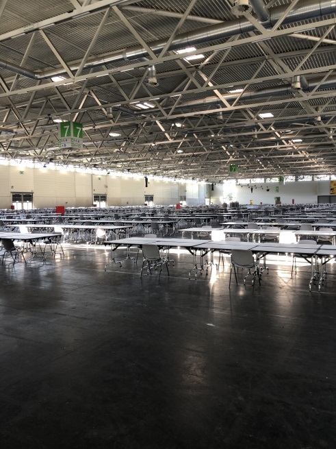 4.500 Tische, 3.200 Stühle, 90 Countern mit insgesamt 180 Arbeitsplätzen, 60 Laptops inklusive Verkabelung müssen aufgebaut werden. Aufgrund der Corona-Situation ist bei dem Aufbau des Briefwahlzentrums in diesem Jahr vor allem die Einhaltung der Coronaschutzmaßnahmen zu beachten. Aus diesem Grund wurde Briefwahlzentrum im Vergleich zur Kommunalwahl 2014 enorm vergrößert. War das Briefwahlzentrum vor sechs Jahren noch 6.000 Quadratmeter groß, erstreckt es sich in diesem Jahr über zwei Hallen auf insgesamt 36.000 Quadratmeter. Somit ist gewährleistet, dass die notwendigen Abstände eingehalten werden können.
