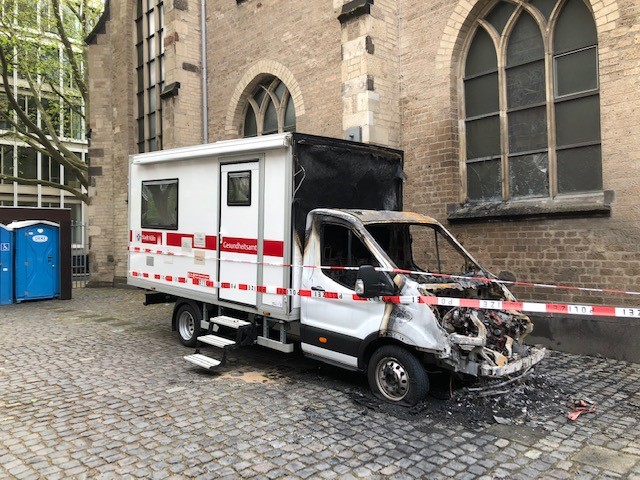 In der Nacht vom 10. Mai auf den 11. Mai 2021 fing gegen 0.30 Uhr einer der beiden Busse des mobilen Drogenkonsum-Angebots am Cäcilienhof aus bislang unbekannter Ursache Feuer. Ersten Ermittlungen zufolge können weder ein technischer Defekt noch Brandstiftung ausgeschlossen werden. Das Feuer brach im Motorraum des Beratungsbusses aus, das Fahrzeug erlitt durch die Flammen einen Totalschaden. Die Stadt will schnellstmöglich eine Notversorgung mit Spritzenausgabe in einem Pavillion Cäcilienhof anbieten.