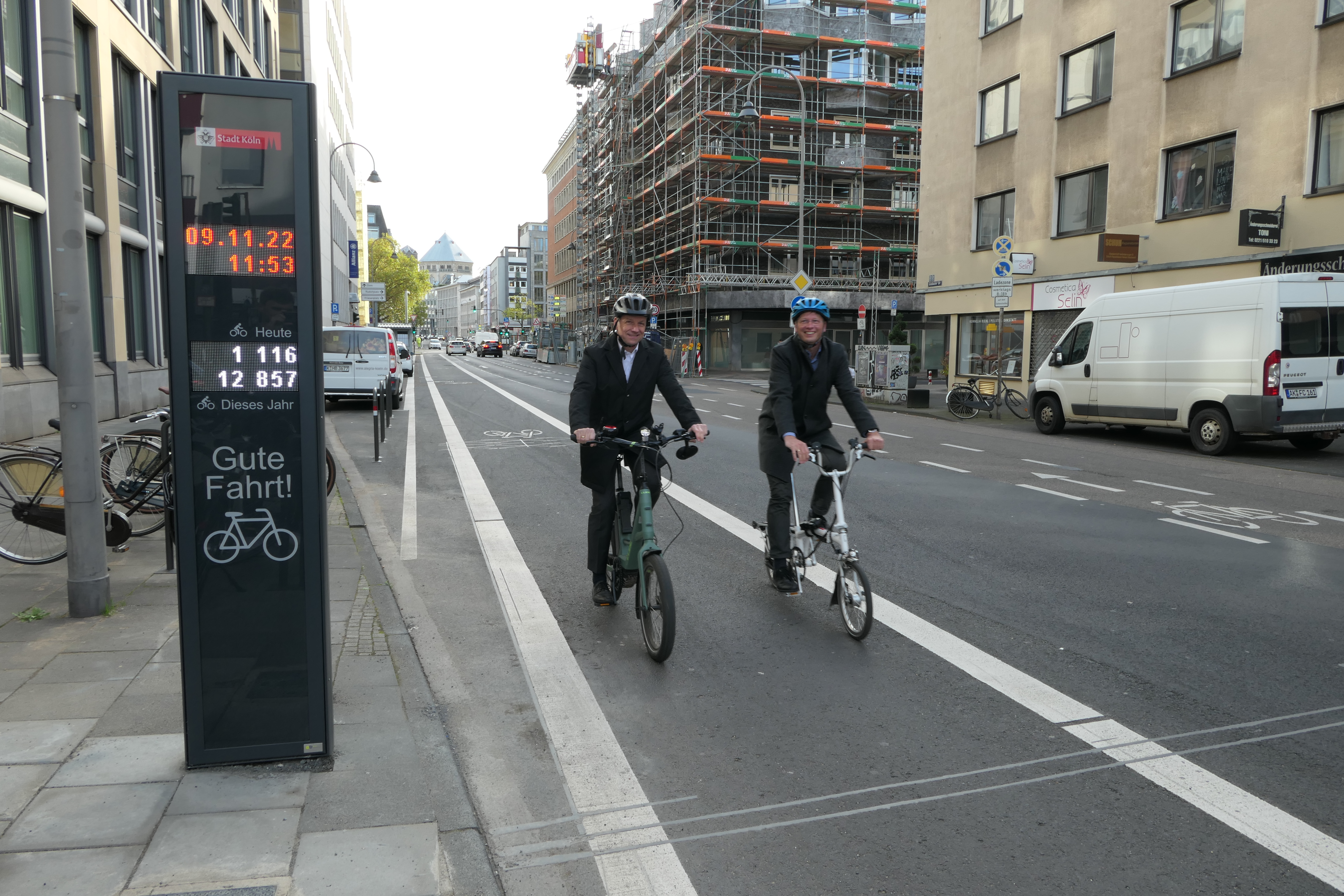 Auf der Gladbacher Straße in der Innenstadt wurde am Mittwoch, 9. November 2022, die 18. Fahrrad-Dauerzählstelle in Köln offiziell in Betrieb genommen. Neben den gewöhnlichen Zählschleifen im Boden wurde zum ersten Mal in Köln ein Fahrradbarometer aufgestellt.