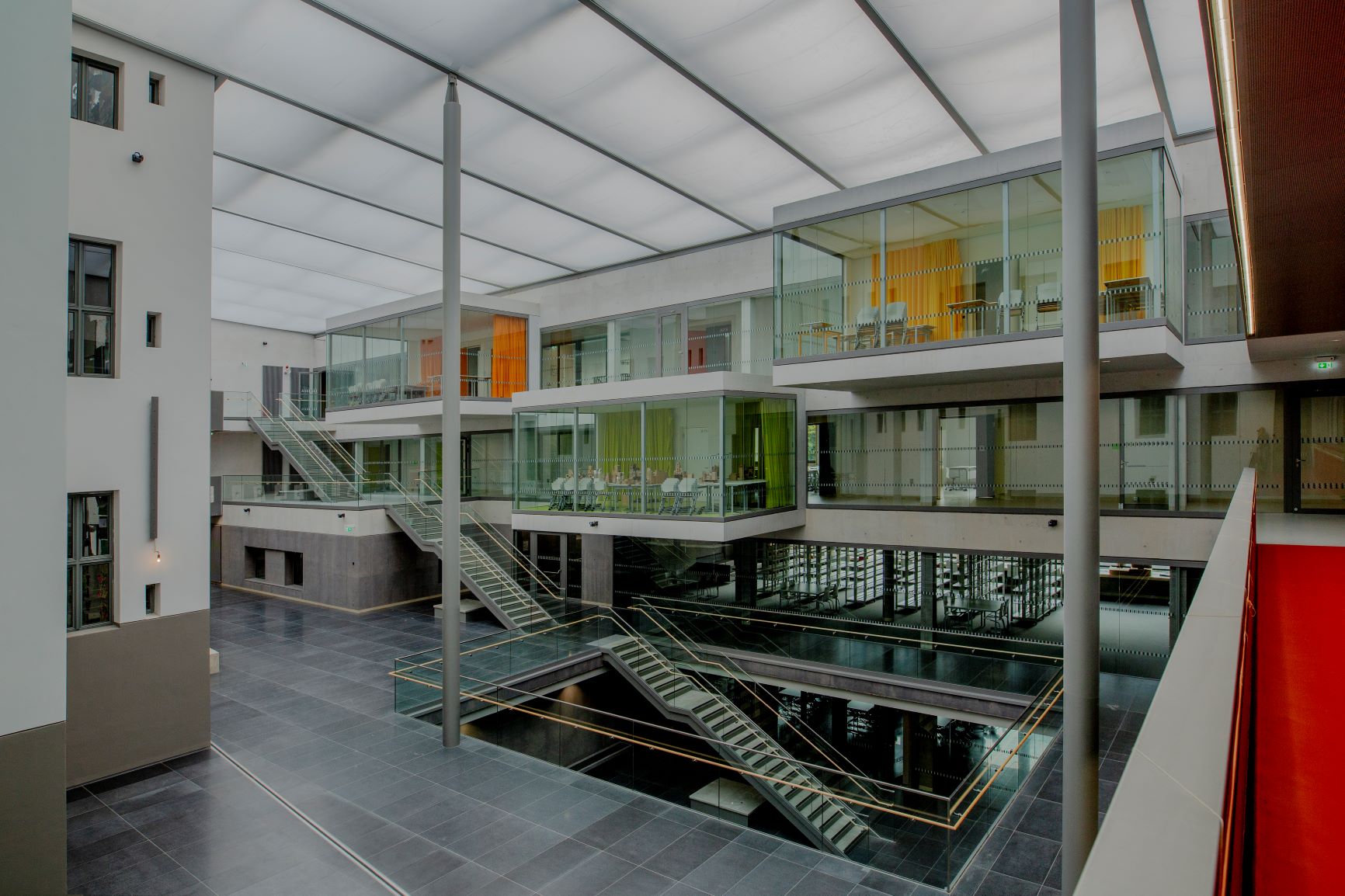 Das Genoveva-Gymnasium besteht jetzt aus einem Hauptgebäude, das durch den Erweiterungsbau ergänzt wird: Hier sind unter anderem eine Einfeldsporthalle, die Bibliothek und die Mensa untergebracht. Außerdem kann in dem Anbau die Ganztagsbetreuung stattfinden und es haben weitere Klassen- und Fachräume in dem Komplex Platz gefunden. Das neue Gebäude ist so gestaltet, dass sich die Schulräume um einen Gemeinschaftsbereich herum gruppieren, der neuer Begegnungsraum für alle ist. Ein zentraler Punkt ist hier die Bibliothek.