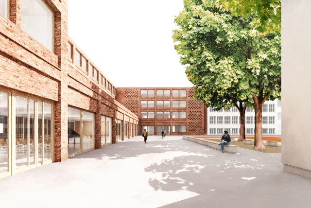 Die Erweiterung um rund 3.500 Quadratmeter Nutzfläche wird im laufenden Schulbetrieb realisiert. Es entstehen ein Kellergeschoss sowie vier Vollgeschosse mit Aufenthaltsräumen. Das neue Gebäude wird mit dem Bestand ein abgeschlossenes Ensemble bilden, den Schulhof umschließen und auf allen Ebenen höhenversetzt an die bestehende Anlage angebunden. Der Pausenhof und der Vorplatz der zukünftigen Dreifachturnhalle werden über das Foyer im Erdgeschoss erschlossen. Die Mensa mit Küche und das Pädagogische Zentrum sowie Betreuungsräume befinden sich im Erdgeschoss. In den oberen Geschossen sind zwei Informatikräume, Fachräume und Klassenräume untergebracht. Das Dach im Bereich über dem Erdgeschoss, das durch den Gebäuderücksprung entsteht, wird begrünt. Das Hauptdach erhält eine Photovoltaikanlage.
