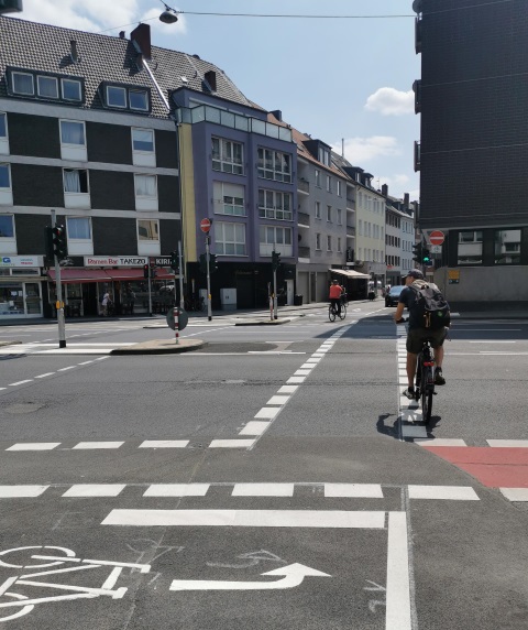 Mit der Mathiasstraße wurde nun der dritte Abschnitt des Straßenzugs geöffnet. Damit dies möglich war, musste zunächst die anstehende Erneuerung der Ampelanlage abgewartet werden. Diese ermöglichte es nun, neue Signalgeber anzuschließen und damit die neue Fahrbeziehung für vom Heumarkt kommende Radfahrende an der Kreuzung mit dem Mühlenbach einzurichten. Auf einem ehemaligen Stellplatz wurde eine Aufstellfläche für den querenden Radverkehr geschaffen, der bei Grün über eine neue Furt in die Mathiasstraße einfahren kann. Auch für Radfahrende, die in Einbahnstraßenrichtung unterwegs sind, wurde die Ausfahrt aus der Mathiasstraße auf den Mühlenbach durch vorgezogene Haltlinien verbessert.
