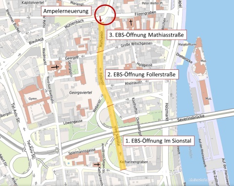Während der Waidmarkt derzeit für alle Fahrzeuge baustellenbedingt nicht befahrbar ist, ergibt sich durch die neue Einbahnstraßenöffnung eine attraktive Verbindung, mit der die Baustelle für vom Heumarkt kommenden Radverkehr über die Mathiasstraße – Follerstraße – Webergasse umfahren werden kann.