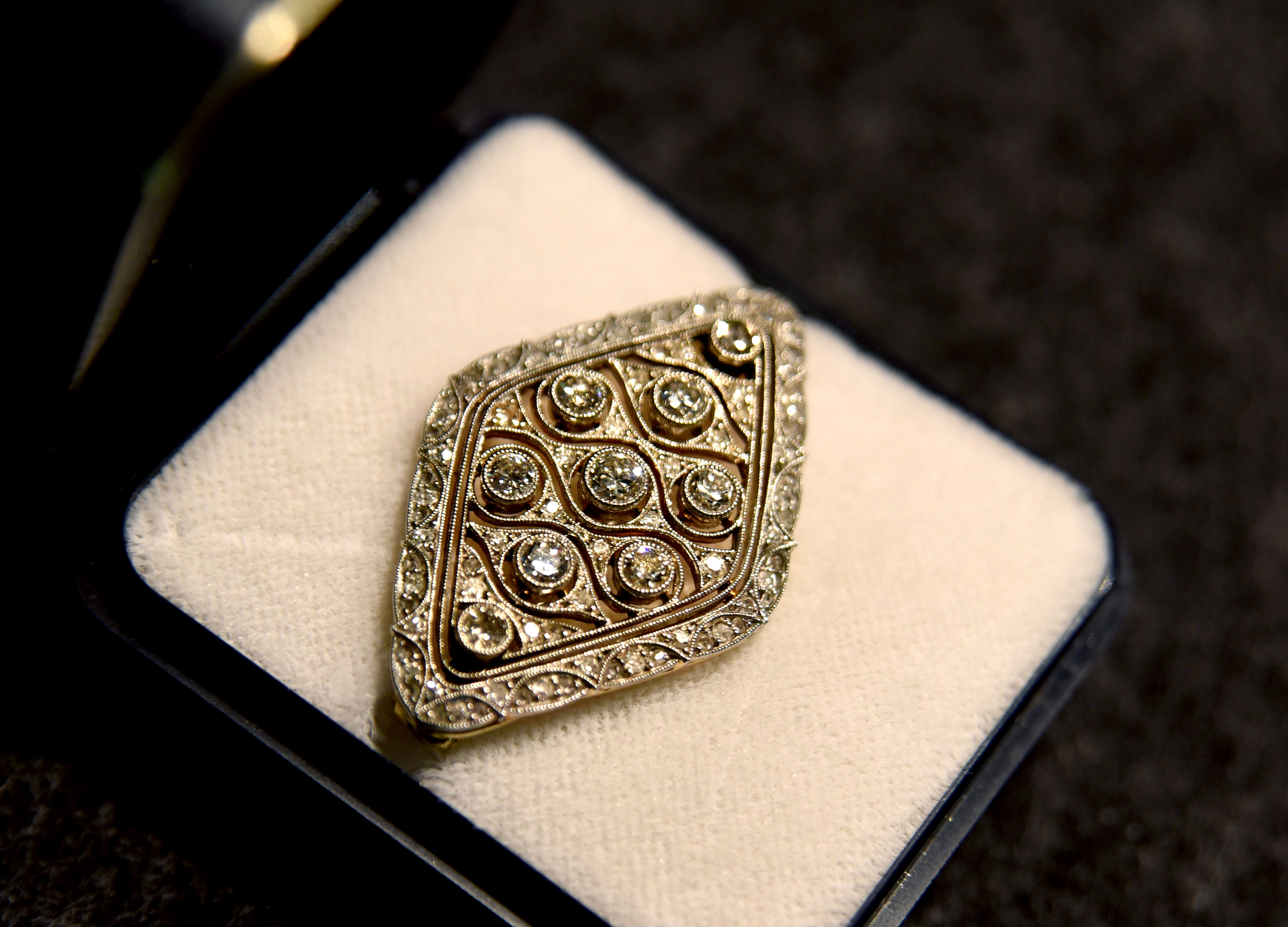 - Von 9 bis 12 Uhr kommen unter anderem Geldbörsen, Echt- und Modeschmuck, Spielzeuge, Kopfhörer, Handys, Musikboxen, Kleidung, Taschen, Tretroller und Wundertüten unter den Hammer. Ein besonderes Fundstück, welches in der Versteigerung angeboten wird, ist eine Brosche im Art Deco-Stil (siehe Foto). Sie besteht aus 750er Gelb- und Weißgold, ist mit Diamanten besetzt und wiegt insgesamt 7,04 Gramm.