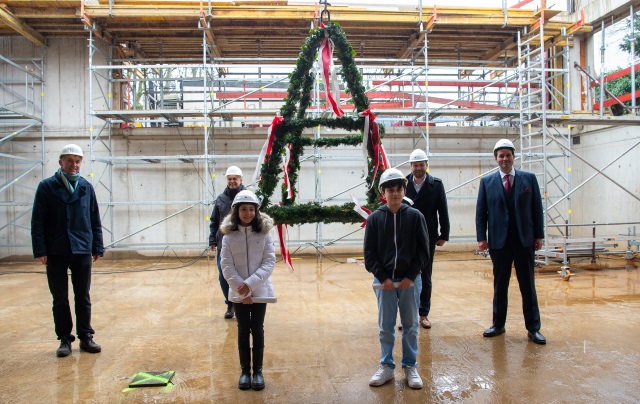 Die Schulgemeinschaft des Rhein-Gymnasiums freut sich über das Richtfest der neuen Einfachturnhalle, am heutigen Montag, 21. Februar 2022, vertreten durch Schulleiter Marco Isermann und zwei Schüler*innen, gemeinsam mit Robert Voigtsberger, Beigeordneter für Bildung, Jugend und Sport, Anne Lena Ritter, Leiterin des Amtes für Schulentwicklung, Leonard Karren vom Bauprojektmanagement I, Uli Herrmann vom Büro sh8 Architekten sowie Vertreter*innen der beteiligten Firmen. Die Halle ist Teil der Schulerweiterung für das Gymnasium an der Düsseldorfer Straße in Köln-Mülheim. In die Schulbaumaßnahme investiert die Stadt Köln insgesamt rund 6,6 Millionen Euro und schafft damit etwa 1.250 Quadratmeter Nutzfläche.