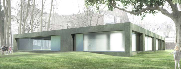 Der Rohbau der "Grünen Halle" ist fertiggestellt: Neben einer begrünten Fassade erhält sie auch ein bepflanztes Dach. Eingang, Umkleiden und Waschräume der neuen Turnhalle im Erdgeschoss, der Geräteraum und die Umkleide für Lehrkräfte inklusive der Halle befinden sich aus baurechtlichen Gründen im Untergeschoss. Auf dem Campus stehen bereits das Rhein-Gymnasium Düsseldorfer Straße 13 mit Turnhalle und Aula sowie der Nebenstandort Düsseldorfer Straße 9 der Grundschule Mülheimer Freiheit 99 und die blaue Turnhalle.