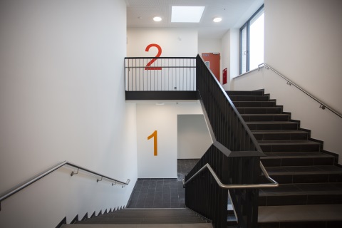 Durch offene Flurzonen und ein großflächiges Dachoberlichtband wird das Gebäude optimal und klimaschonend belichtet. Für die Nachhaltigkeit bei Planung und Bau zeugen zudem die Errichtung in klimaschonender Passivhausbauweise sowie eine große Photovoltaikanlage auf dem Dach mit Modulen. Die Innenräume sind transparent und hell gestaltet, um eine angenehm freundliche Atmosphäre und eine hohe Aufenthaltsqualität zu schaffen. Gelernt wird in sogenannten Clustern, das sind Raumgruppen mit angebunden Kommunikations- und Küchenbereichen, die sowohl dem differenzierten Lernen als auch der Erholung und der Begegnung dienen. Ein Schul-Café mit einer großzügigen Aufenthaltszone an der Westgiebelseite des Neubaus lädt ebenso zum Verweilen ein.