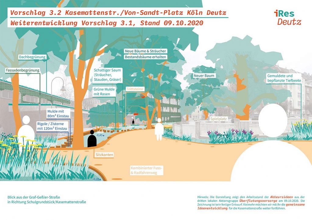 Die klimaangepasste Umgestaltung der Kasemattenstraße ist nötig, weil es sich um einen Bereich mit starker Hitzebelastung und Überflutungsgefahr bei Starkregen handelt. In fünf Treffen wurde gemeinsam mit den Anwohnenden sowie Vertreter*innen der Stadtentwässerungsbetriebe Köln (StEB) und der städtischen Fachämter eine Lösung dazu entwickelt. An der Stelle, an der sich aktuell Lehrerparkplätze befinden, soll eine Mulde gebaut werden, unter der sich dann unterirdisch eine Rigole und eine Zisterne befinden werden. Im Starkregenfall sammelt sich das Wasser in der Mulde und fließt von dort zunächst in die Rigole, wo es nach und nach ins Grundwasser versickert. Wenn die Rigole voll ist, fließt das Restwasser in eine Zisterne, von wo aus es dann zur Bewässerung der umliegenden Grünflächen entnommen werden kann.