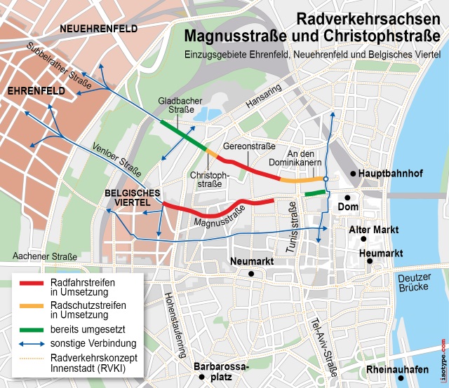 Die Stadt Köln gestaltet in der Kölner Innenstadt die Achse Christophstraße – Gereonstraße – Unter Sachsenhausen – An den Dominikanern zwischen der Fußgängerzone am Kaiser-Wilhelm-Ring und dem Kreisverkehr Marzellenstraße in beiden Fahrtrichtungen radverkehrsfreundlich um. Mit den ersten Vorarbeiten wird in der nächsten Woche begonnen.
