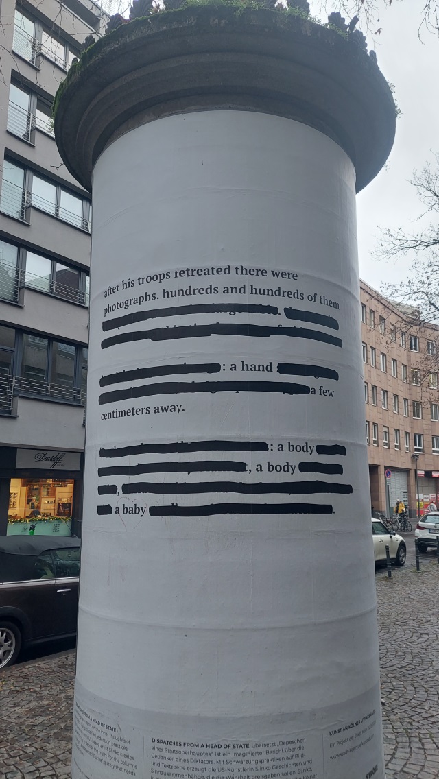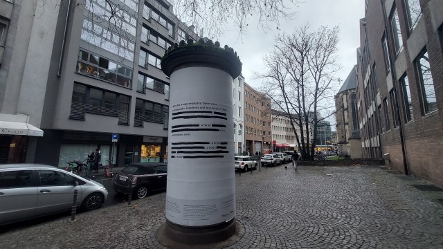Mit "Dispatches From A Head Of State" der ukrainischen Künstlerin Slinko, beginnt die "neue Staffel" der im August 2022 ausgewählten Künstler*innen, die sich mit unterschiedlichen Motiven auf die neuerliche Ausschreibung "Kunst an Kölner Litfaßsäulen" der Stadt Köln beworben haben. Neu war, dass die Stadt Köln ihre Ausschreibung nicht nur in deutscher und englischer, sondern auch in ukrainischer Sprache veröffentlicht hat. Nach dem Auftakt von Slinko folgt ein Motiv der ukrainischen Künstlerin Alona Shostko und anschließend Gestaltungen von Antonia Gruber, Vera Drebusch/Florian Egermann, Ruth Weigand und Claudia Konold.